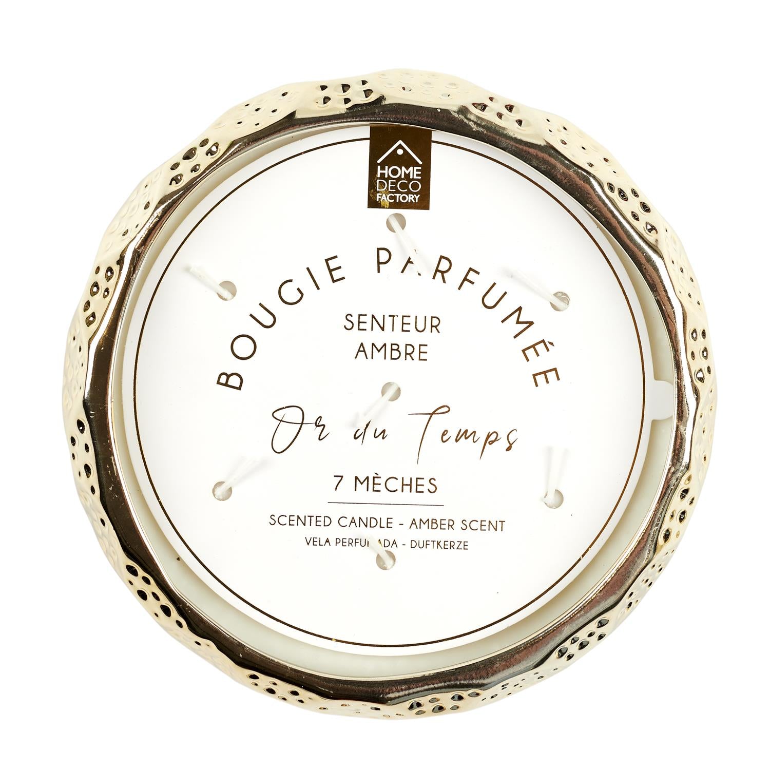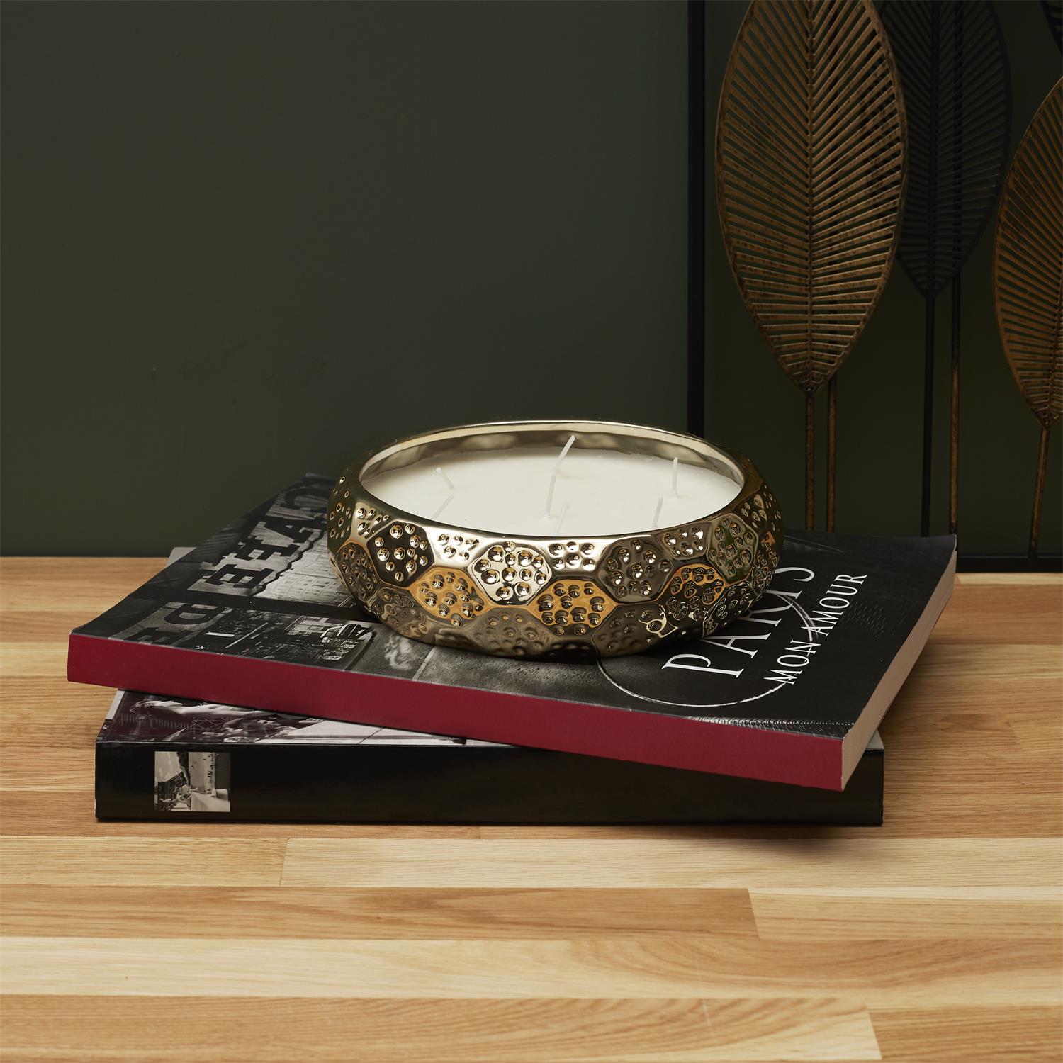 Iespaidīga aromātiskā svece greznā, zelta toņa reljefa traukā, kas radīta kā izteiksmīgs interjera dizaina objekts. Plata forma un bagātīgais zelta mirdzums piešķir telpai siltumu un eleganci, savukārt 7 daktiņas nodrošina īpaši vienmērīgu degšanu un spēcīgu gaismas efektu.