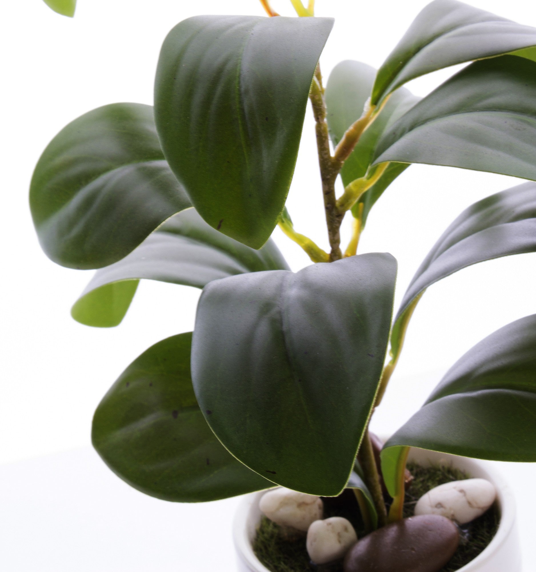 Elegants mākslīgais augs ar dabīga izskata lapām, kas piešķir telpai svaigumu un mājīgumu bez nepieciešamības to kopt. Bagātīgi zaļās, biezās lapas un dabiskā stumbra imitācija rada ļoti reālistisku efektu, savukārt baltais pods ar dekoratīviem akmentiņiem piešķir modernu un tīru akcentu.