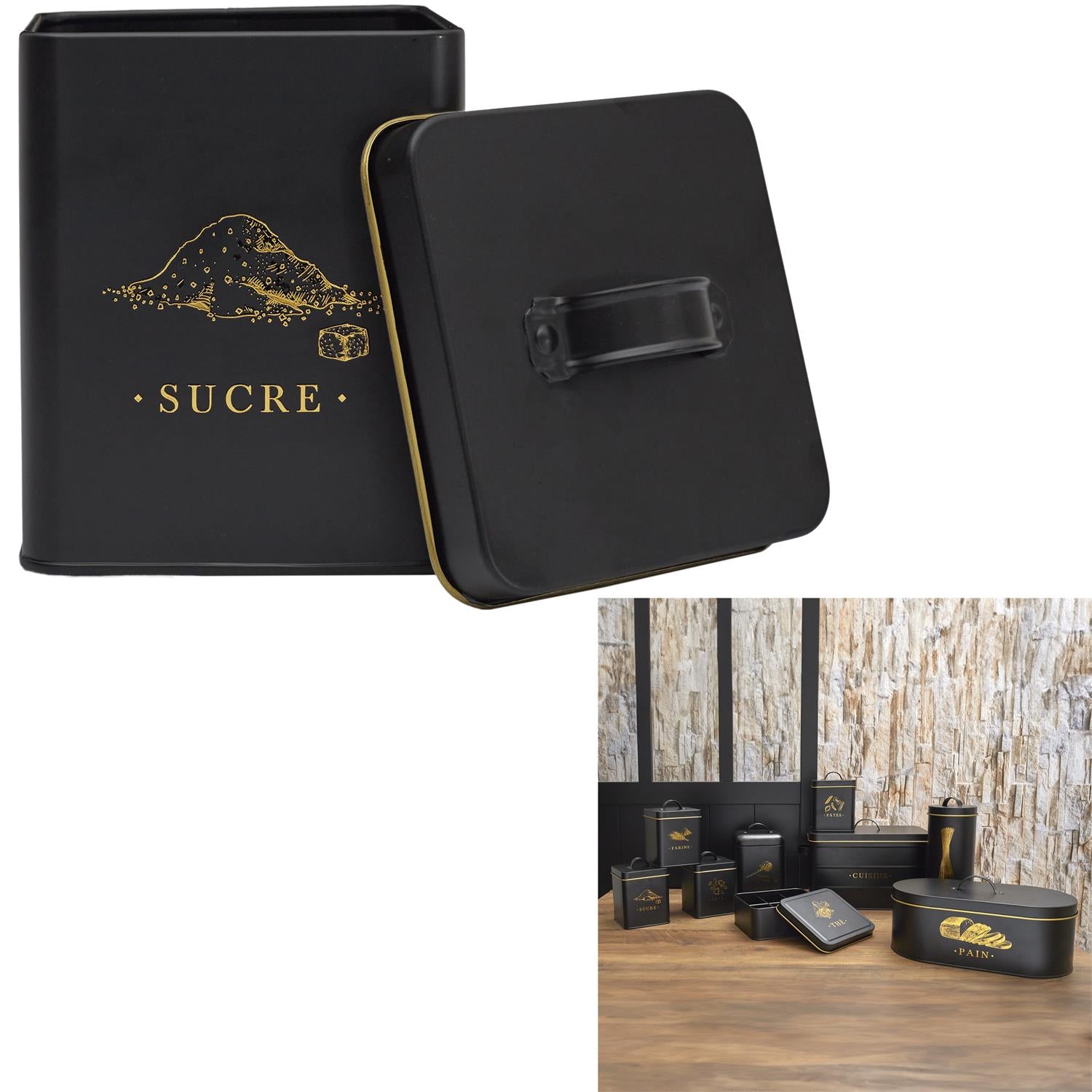 Stilīgs un praktisks metāla virtuves organizators cukura uzglabāšanai, kas apvieno funkcionalitāti ar izsmalcinātu dizainu. Matēti melnais metāla trauks ar zelta krāsas detaļām un dekoratīvu uzrakstu “SUCRE” piešķir virtuvei elegantu, sakārtotu un modernu noskaņu.