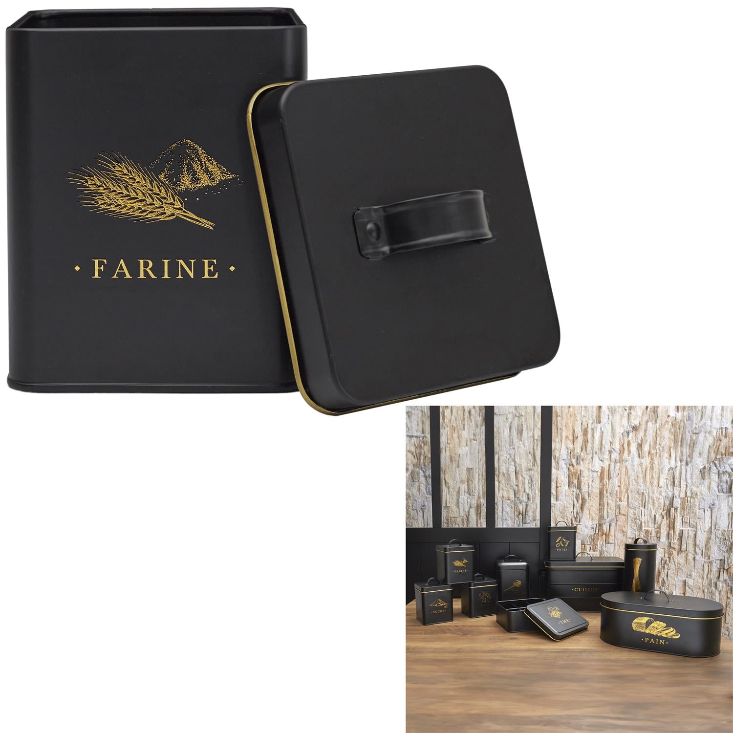 Elegants un funkcionāls metāla trauks miltu uzglabāšanai, kas palīdz uzturēt virtuvi sakārtotu un vizuāli saskaņotu. Matēti melnais dizains ar smalkiem zelta akcentiem un dekoratīvu uzrakstu “FARINE” piešķir virtuvei izsmalcinātu, premium noskaņu.