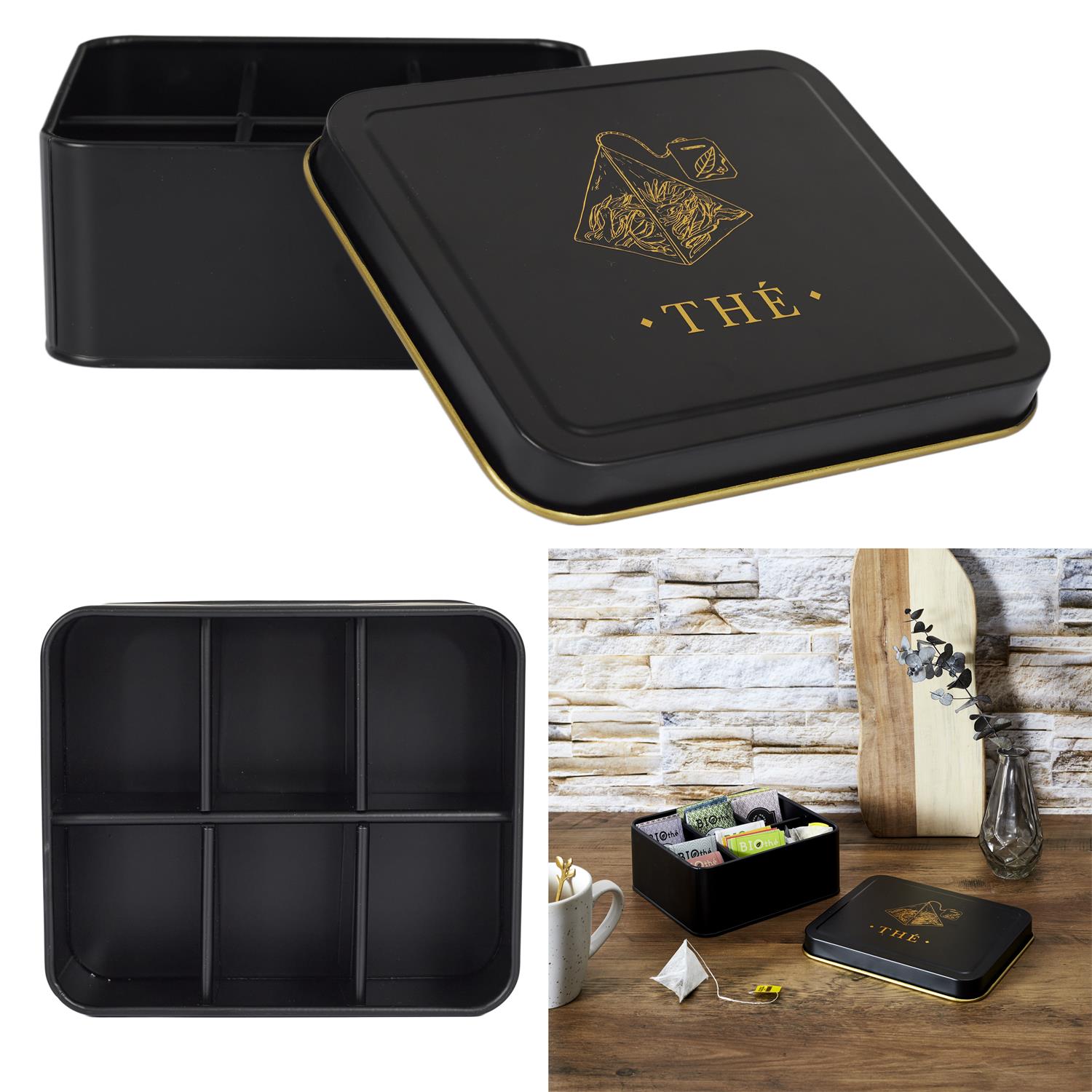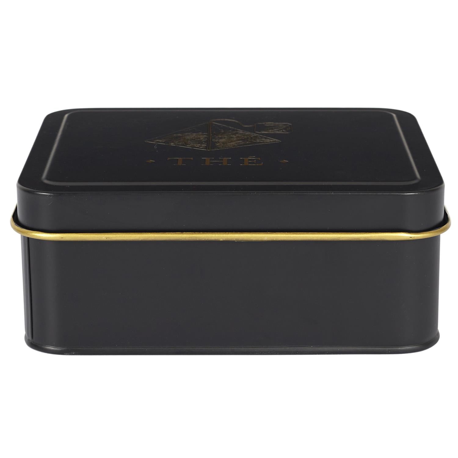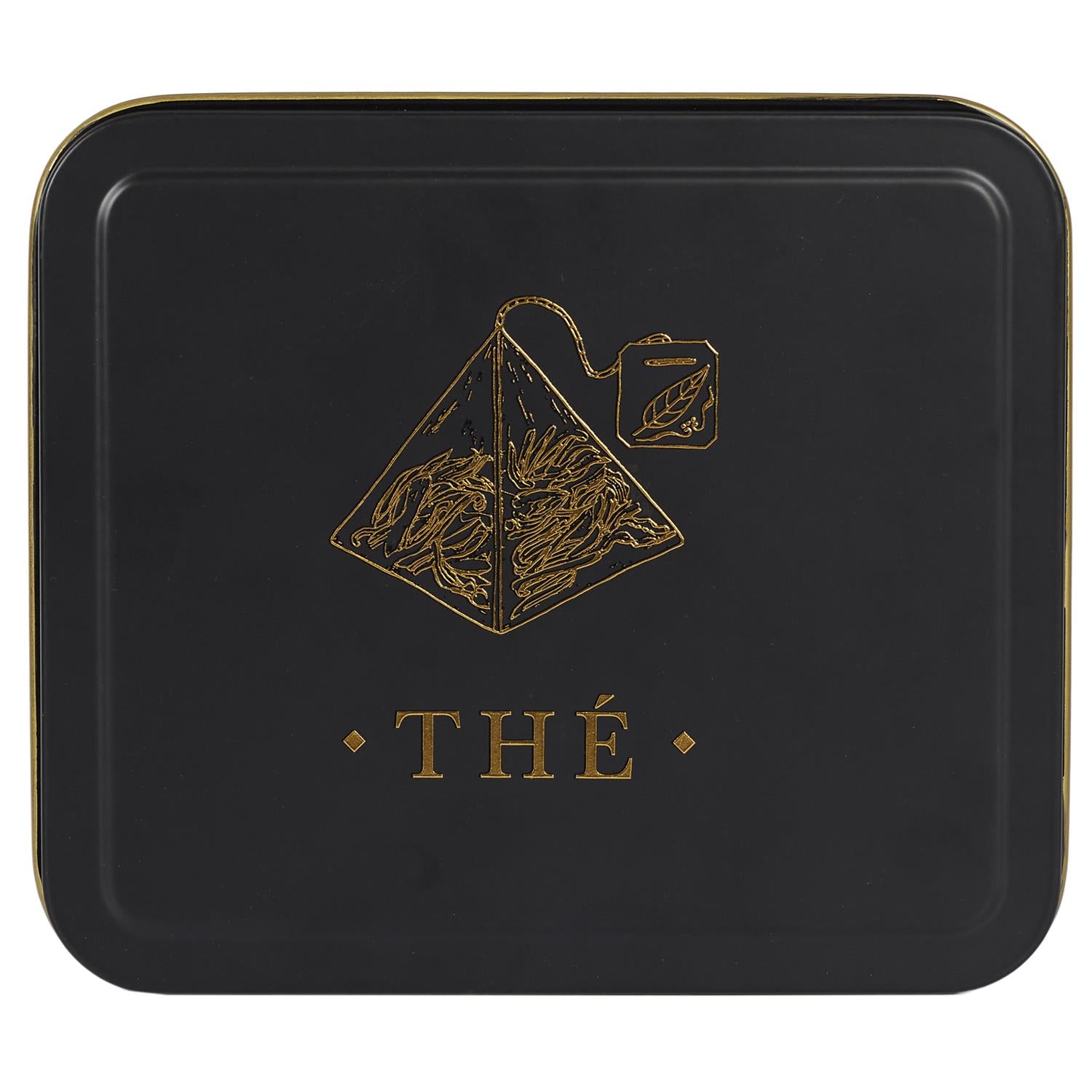 Izsmalcināts metāla tējas uzglabāšanas organizators, kas apvieno funkcionalitāti un estētiku. Matēti melnais dizains ar zelta krāsas ilustrāciju un uzrakstu “THÉ” piešķir traukam greznu un sakoptu izskatu, padarot to par skaistu akcentu gan virtuvē, gan uz kafijas galdiņa.