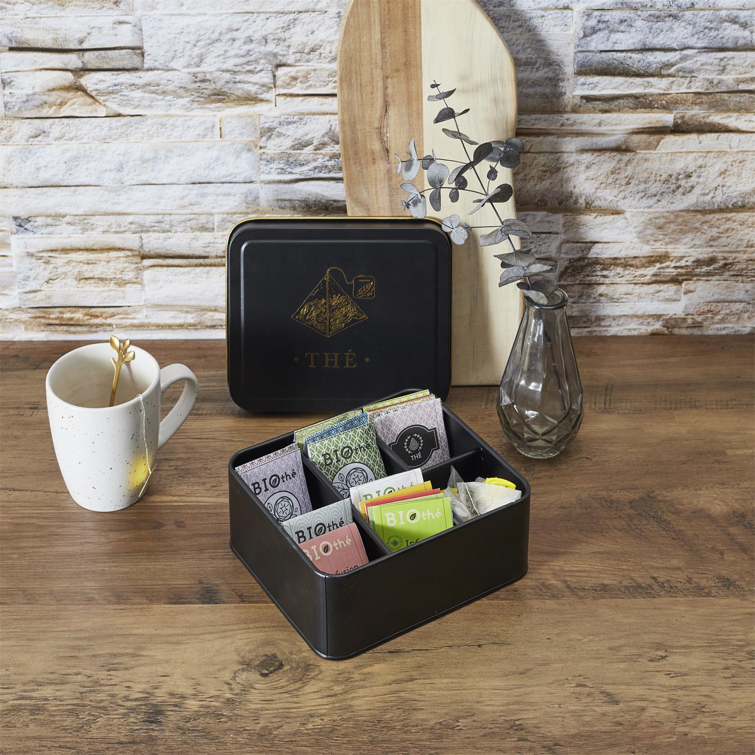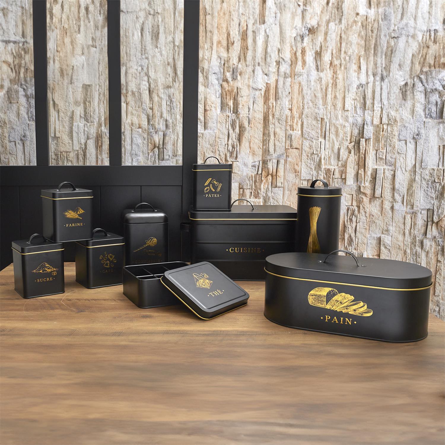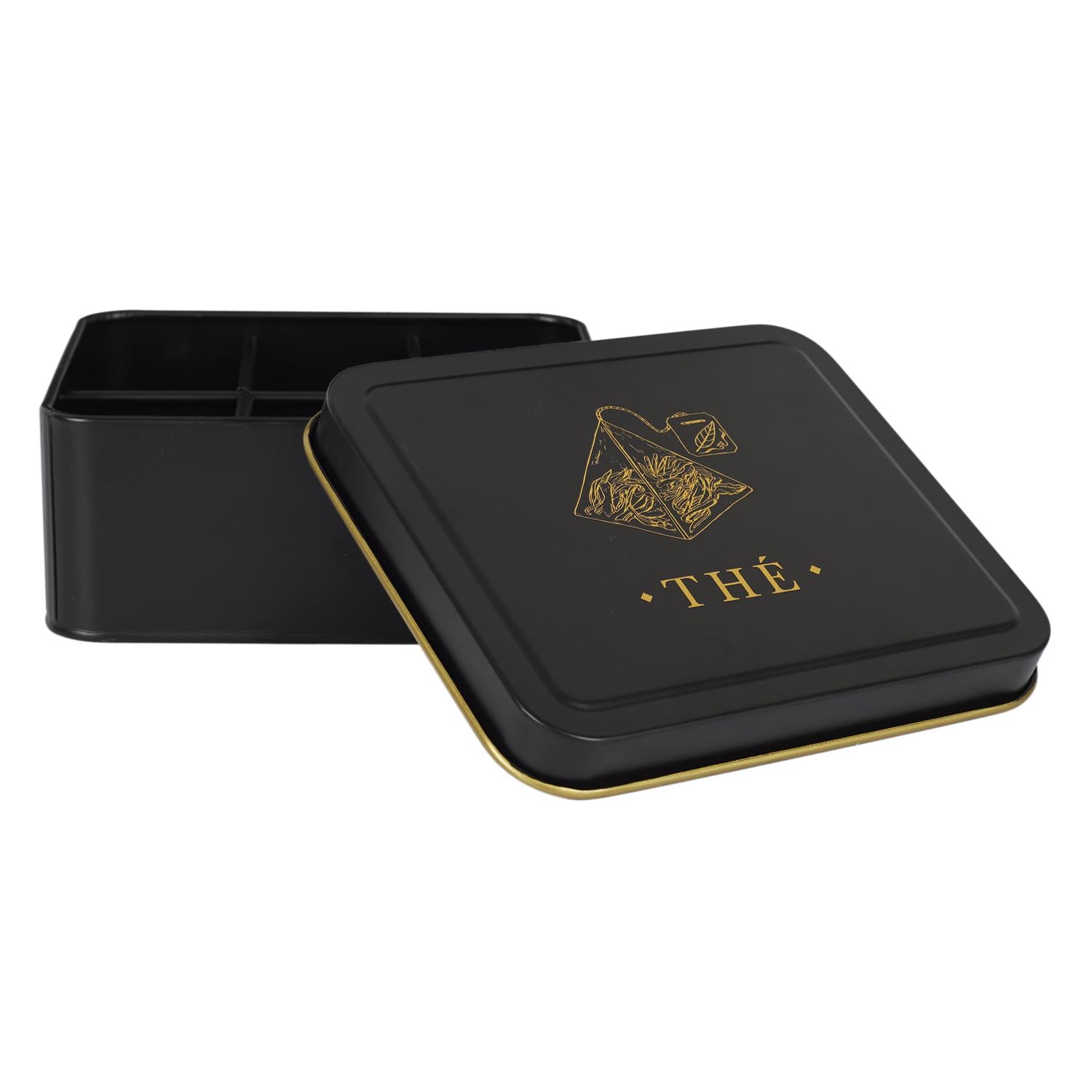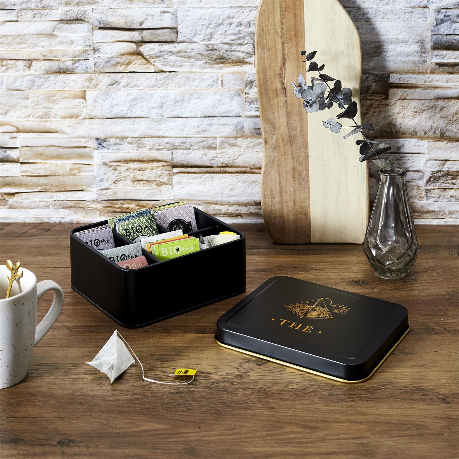 Izsmalcināts metāla tējas uzglabāšanas organizators, kas apvieno funkcionalitāti un estētiku. Matēti melnais dizains ar zelta krāsas ilustrāciju un uzrakstu “THÉ” piešķir traukam greznu un sakoptu izskatu, padarot to par skaistu akcentu gan virtuvē, gan uz kafijas galdiņa.
