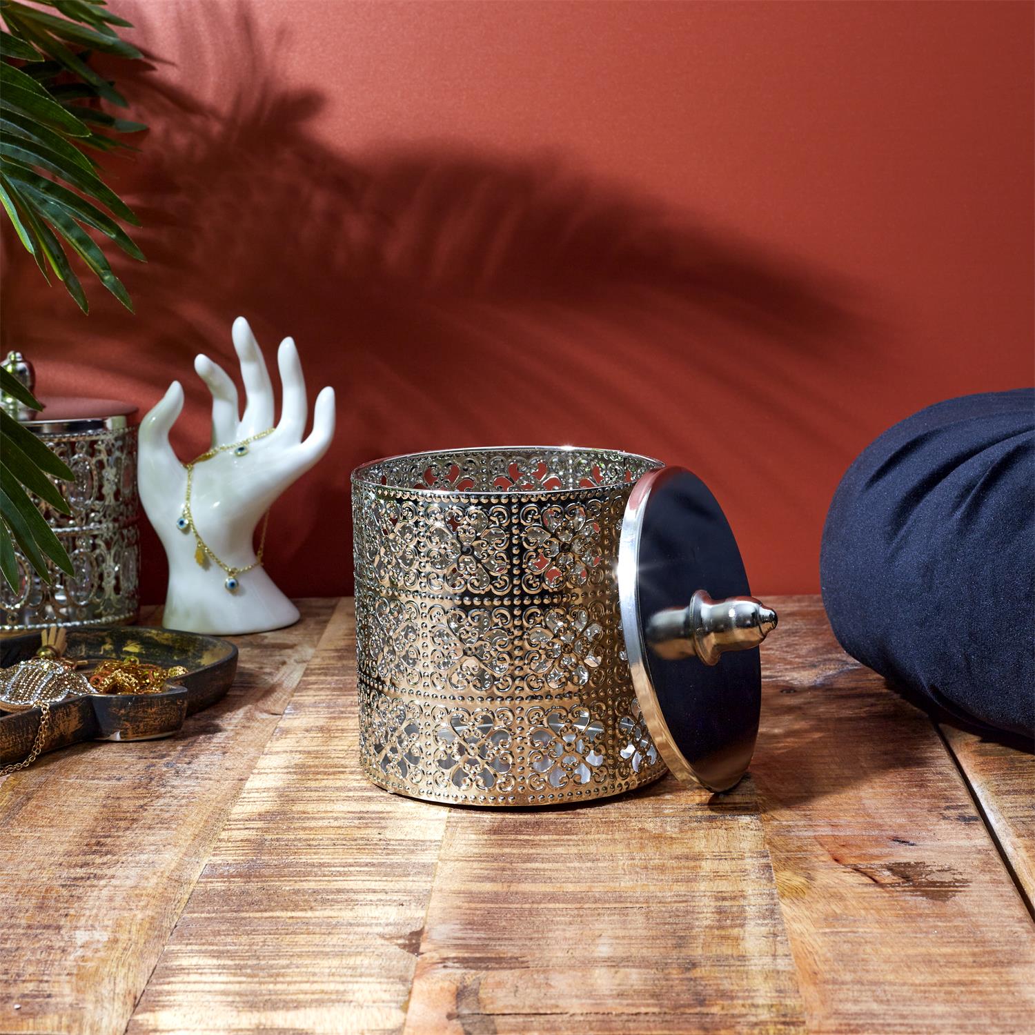 Eleganta metāla kastīte ar ornamentētu virsmu un noņemamu vāku ir izsmalcināts akcents modernam, boho vai glam interjeram. Smalkie izgriezumi piešķir vieglumu un dekoratīvu raksturu, savukārt metāliskais spīdums rada greznu noskaņu.