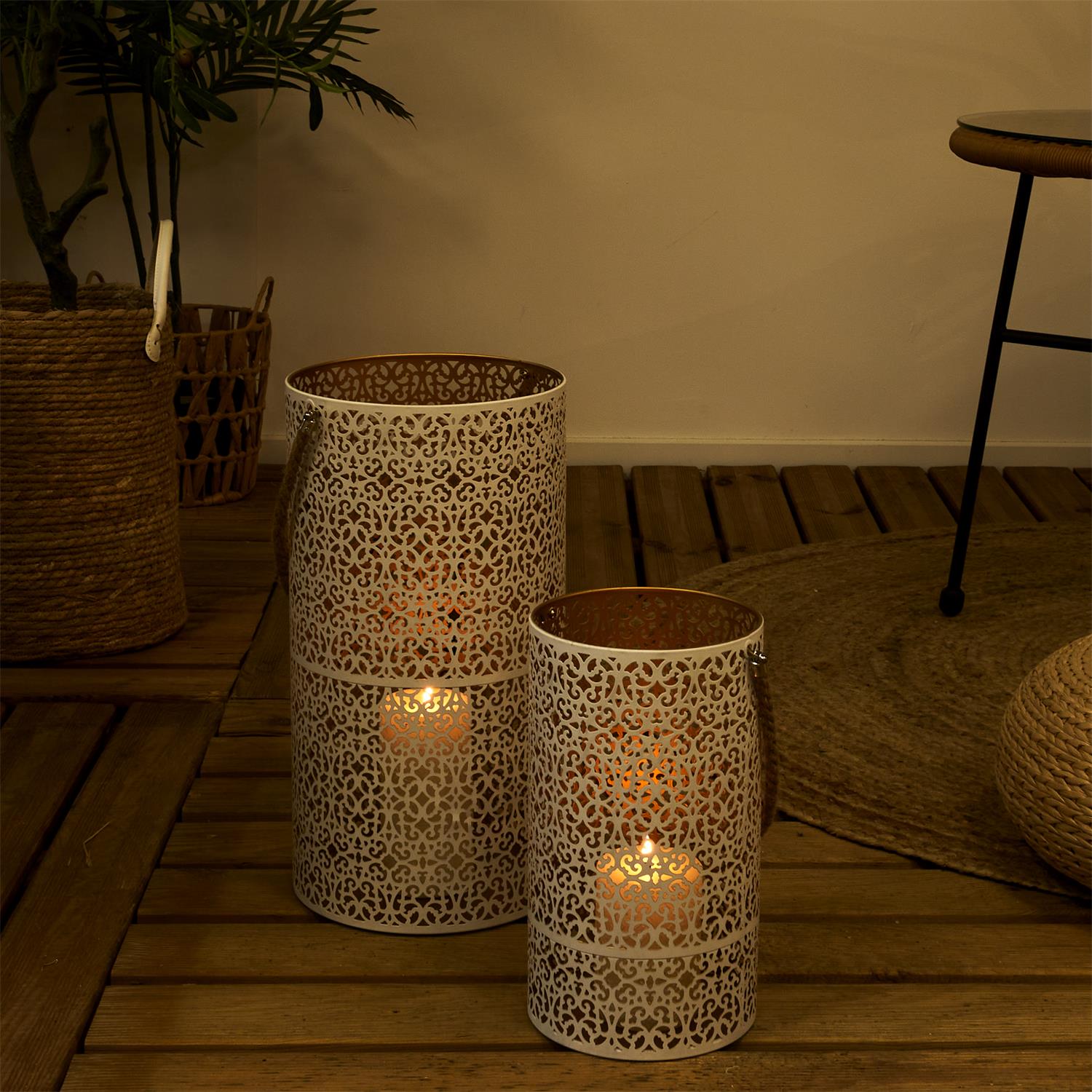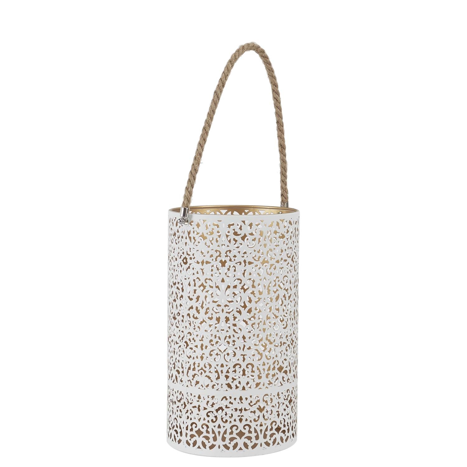 Eleganta metāla laterna ar smalku perforētu rakstu, kas rada īpaši mājīgu un siltu noskaņu. Laternas iekšpuse ir klāta ar zelta pārklājumu, kas, iededzot sveci, skaisti atstaro liesmu un veido burvīgu gaismas spēli uz apkārtējām virsmām.