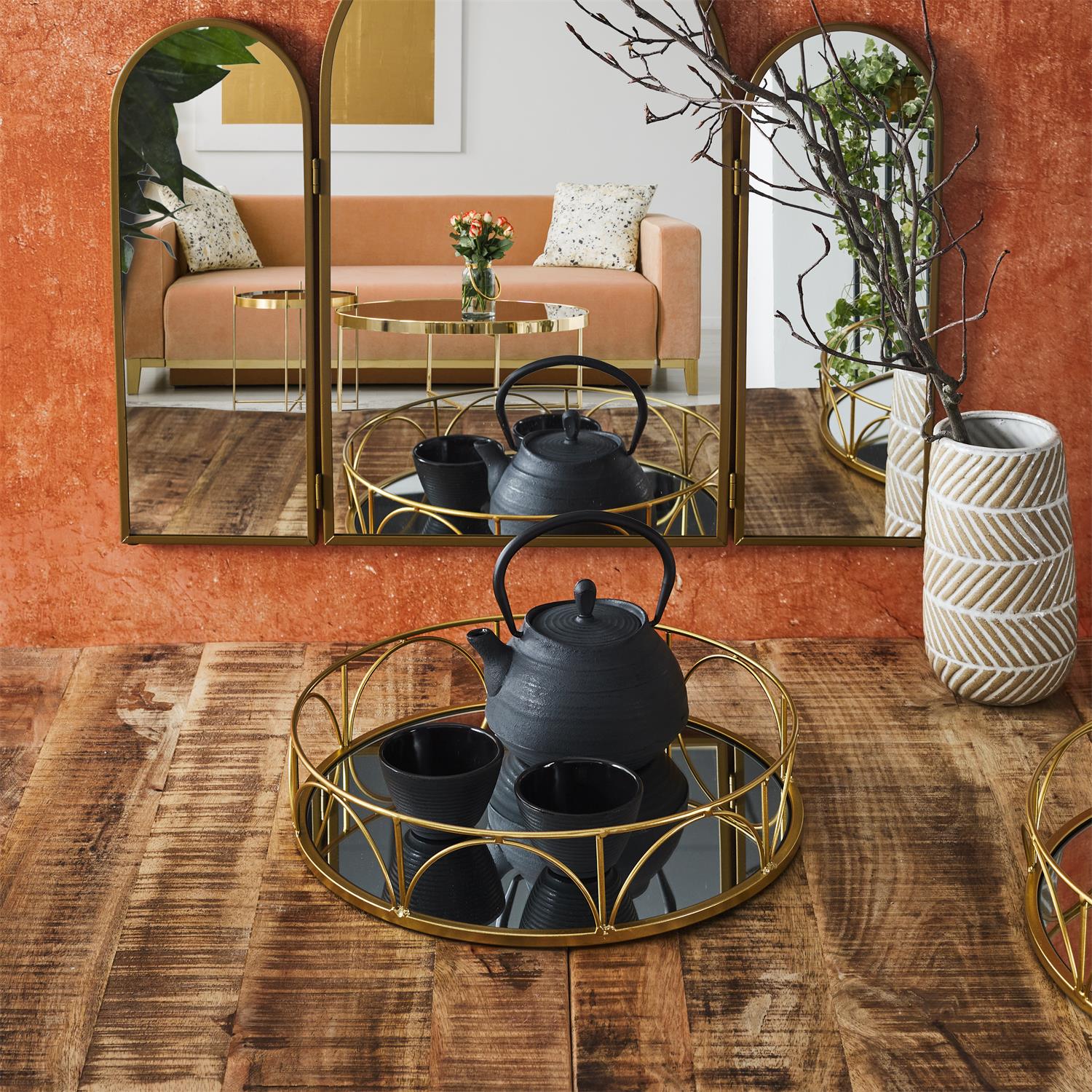 Eleganta apaļa metāla paplāte zelta krāsā ar spoguļa pamatni, kas piešķir telpai vieglu luksusa sajūtu un vizuālu dziļumu. Smalkais metāla rāmis ar ģeometrisku loku motīvu rada gaisīgu, bet izteiksmīgu dizainu, kas lieliski iederas gan modernā, gan klasiskā interjerā.