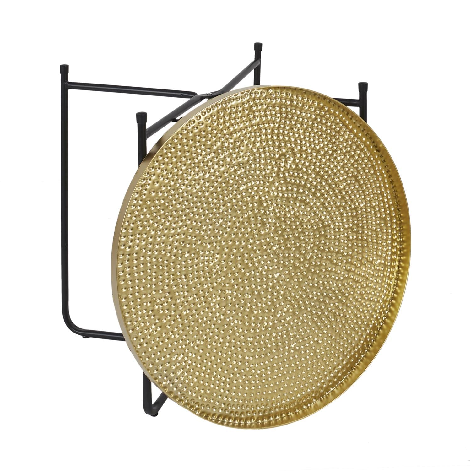 Stilīgs un funkcionāls dekoratīvs piegaldiņš ar noņemamu metāla paplāti, kas lieliski papildina modernu un elegantā interjera noskaņu. Zelta krāsas paplāte  piešķir galdiņam vieglumu un dekoratīvu akcentu, savukārt melnais metāla rāmis nodrošina stabilitāti un vizuālu kontrastu.