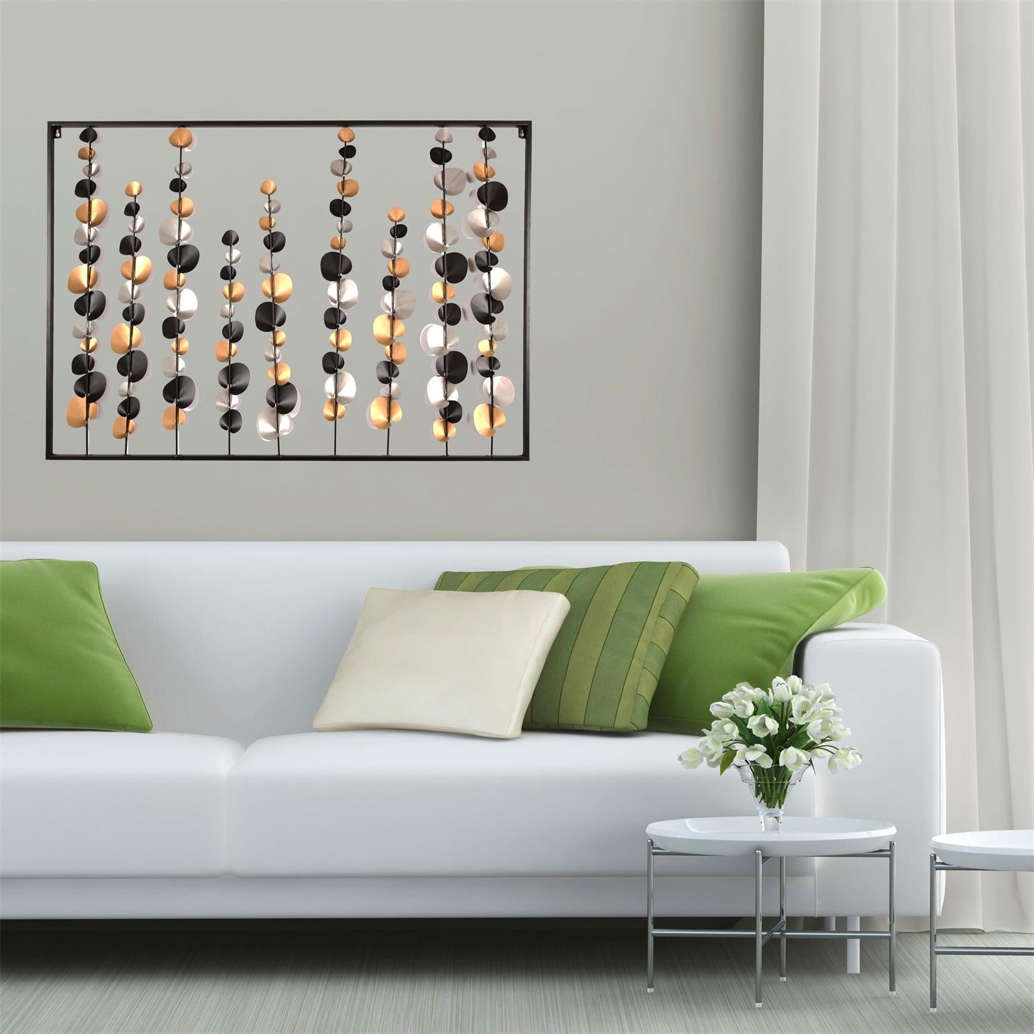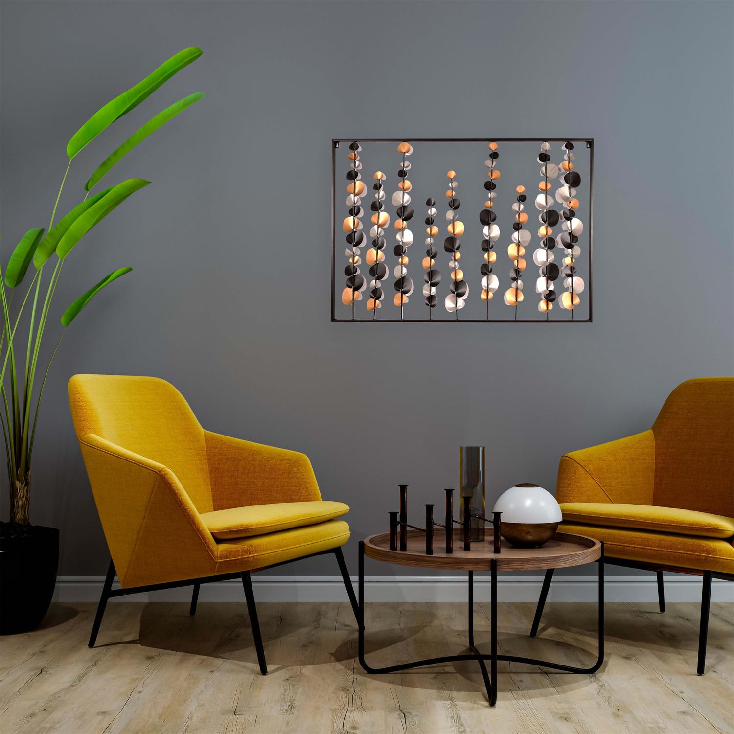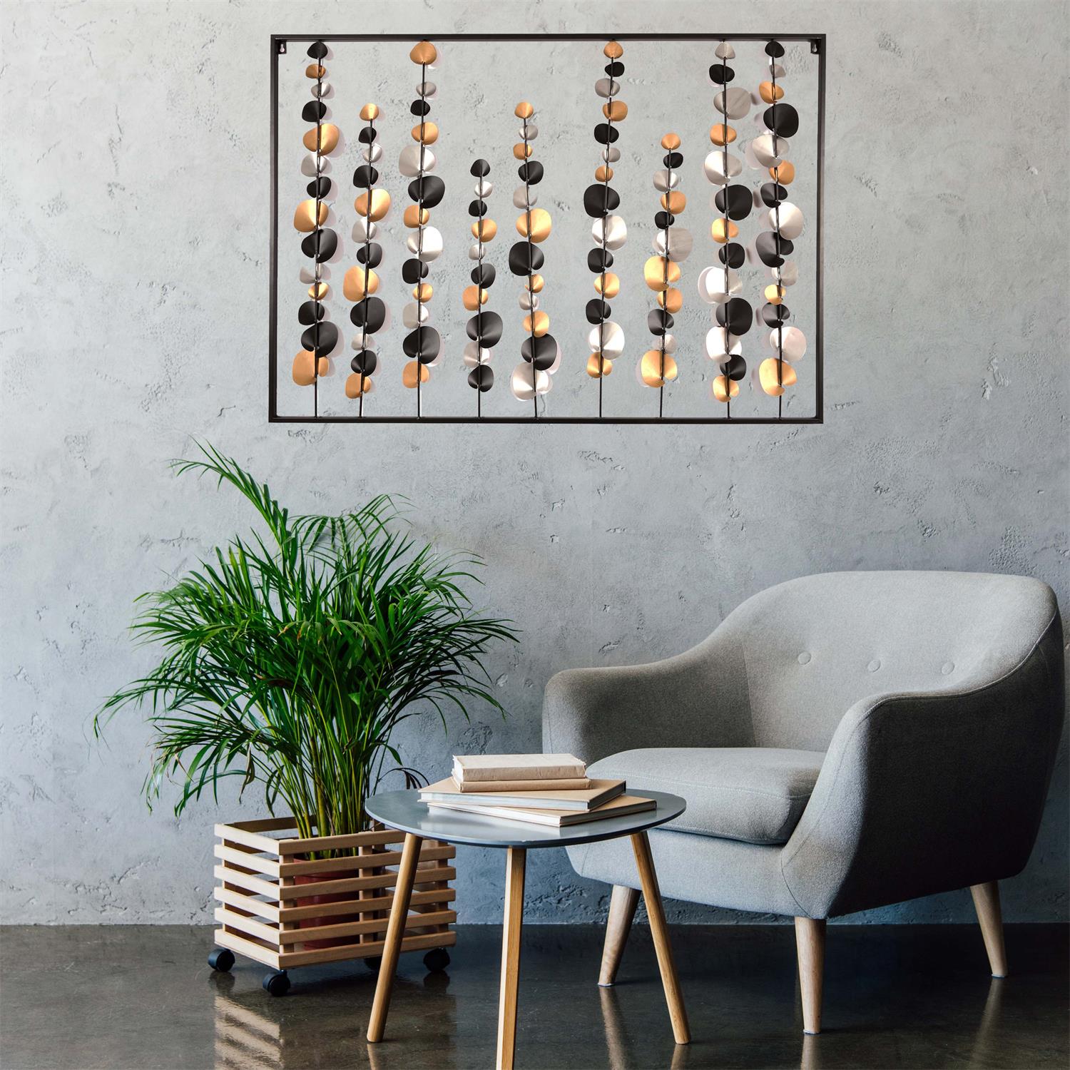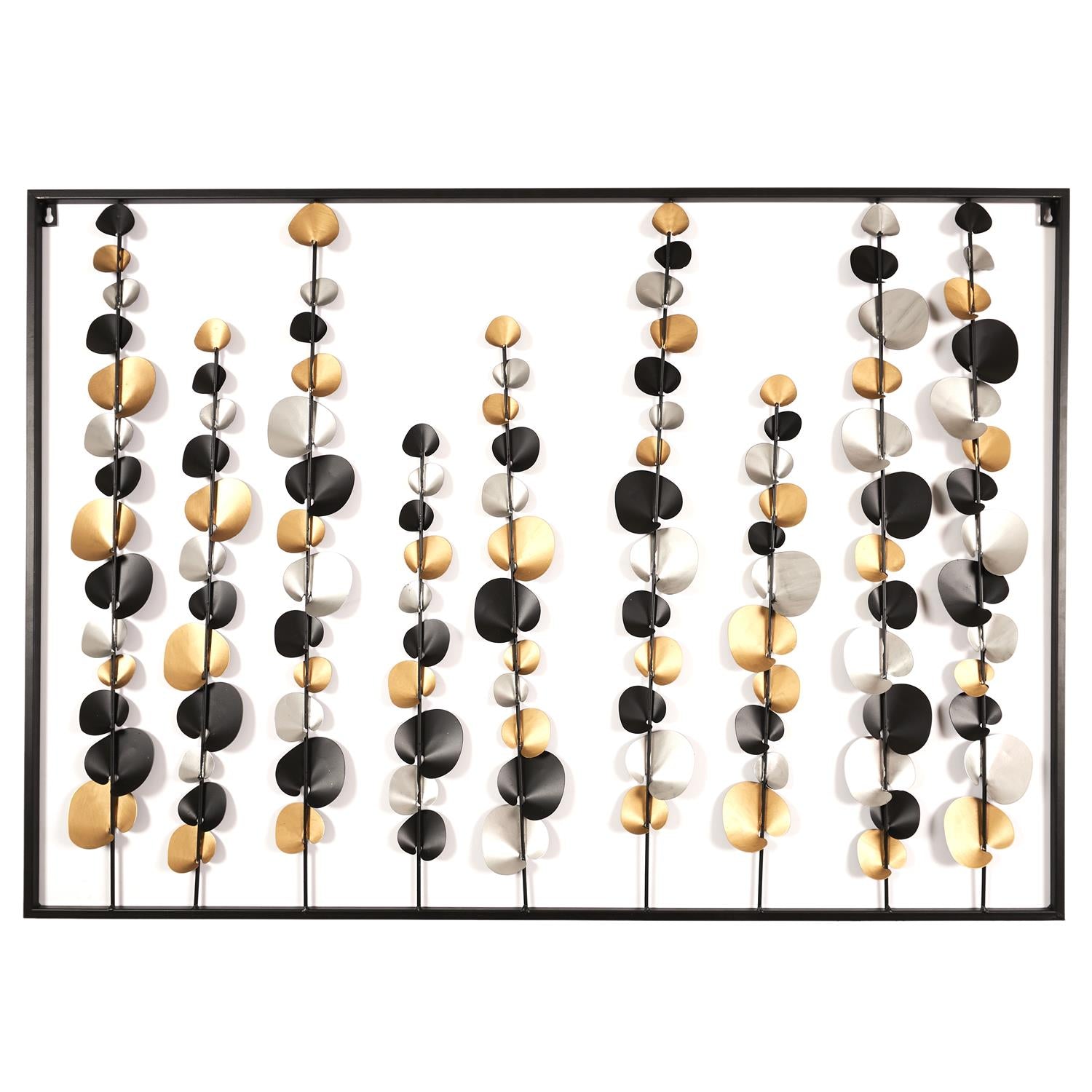 Impozants metāla sienas dekors ar vertikāliem lapu stiebriem, kas apvieno trīs elegantus toņus — melnu, zelta un sudraba. Kontrastu spēle un dinamiskais ritms rada modernu, vizuāli bagātu akcentu, kas lieliski izceļas uz jebkuras sienas.