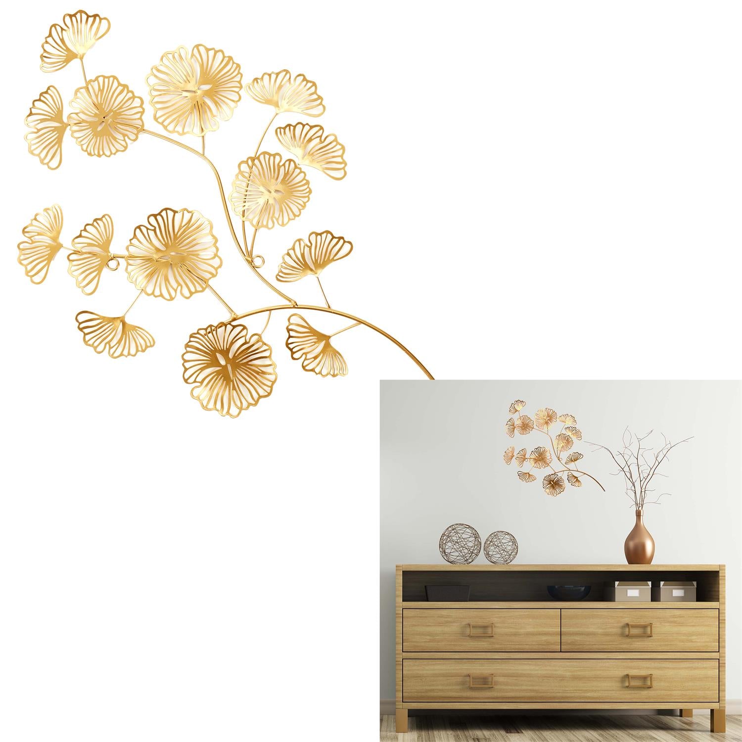 Grezi un izsmalcināti veidots metāla sienas dekors zeltainu lapu un ziedu formā, kas piešķir interjeram vieglumu, eleganci un dabas iedvesmotu harmoniju. Smalkās metāla līnijas un zeltainais spīdums rada luksusa akcentu, kas lieliski izceļas uz gan gaišām, gan tumšām sienām.