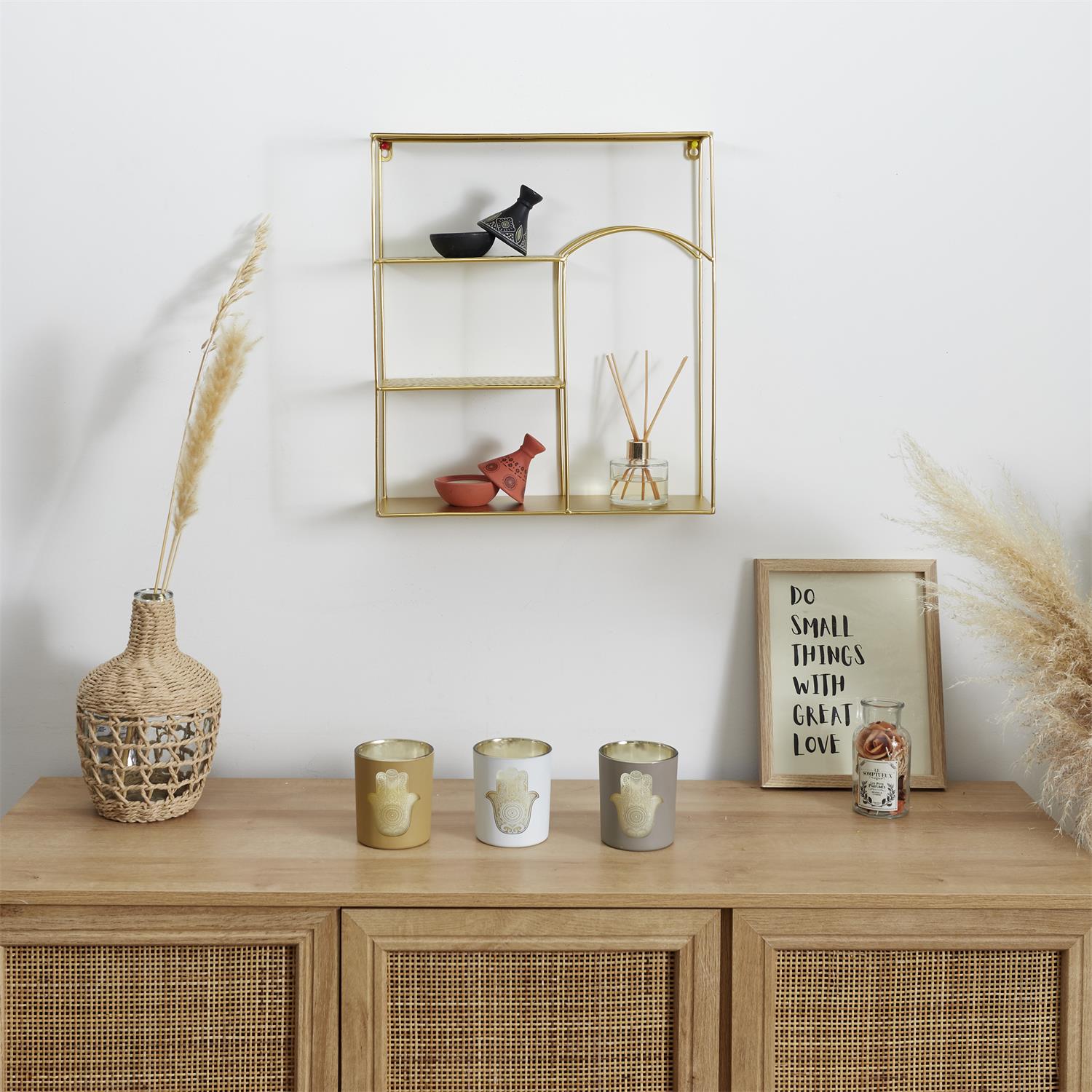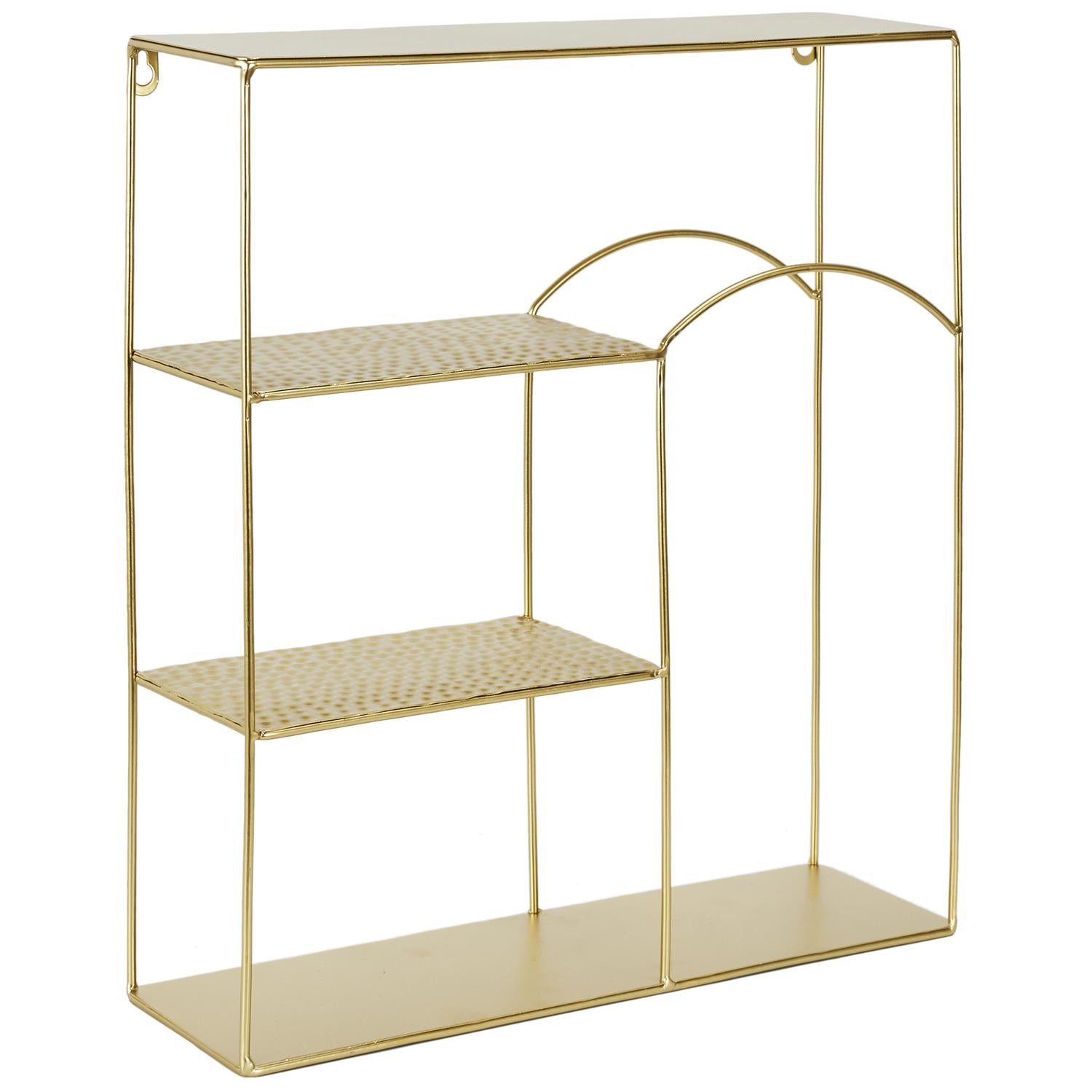 Elegants un viegls metāla sienas plaukts zelta tonī, kas apvieno funkcionalitāti ar izteiksmīgu dizainu. Smalka metāla konstrukcija ar dekoratīvu arkas formu un perforētiem plauktu līmeņiem piešķir interjeram gaisīgumu un izsmalcinātu akcentu.