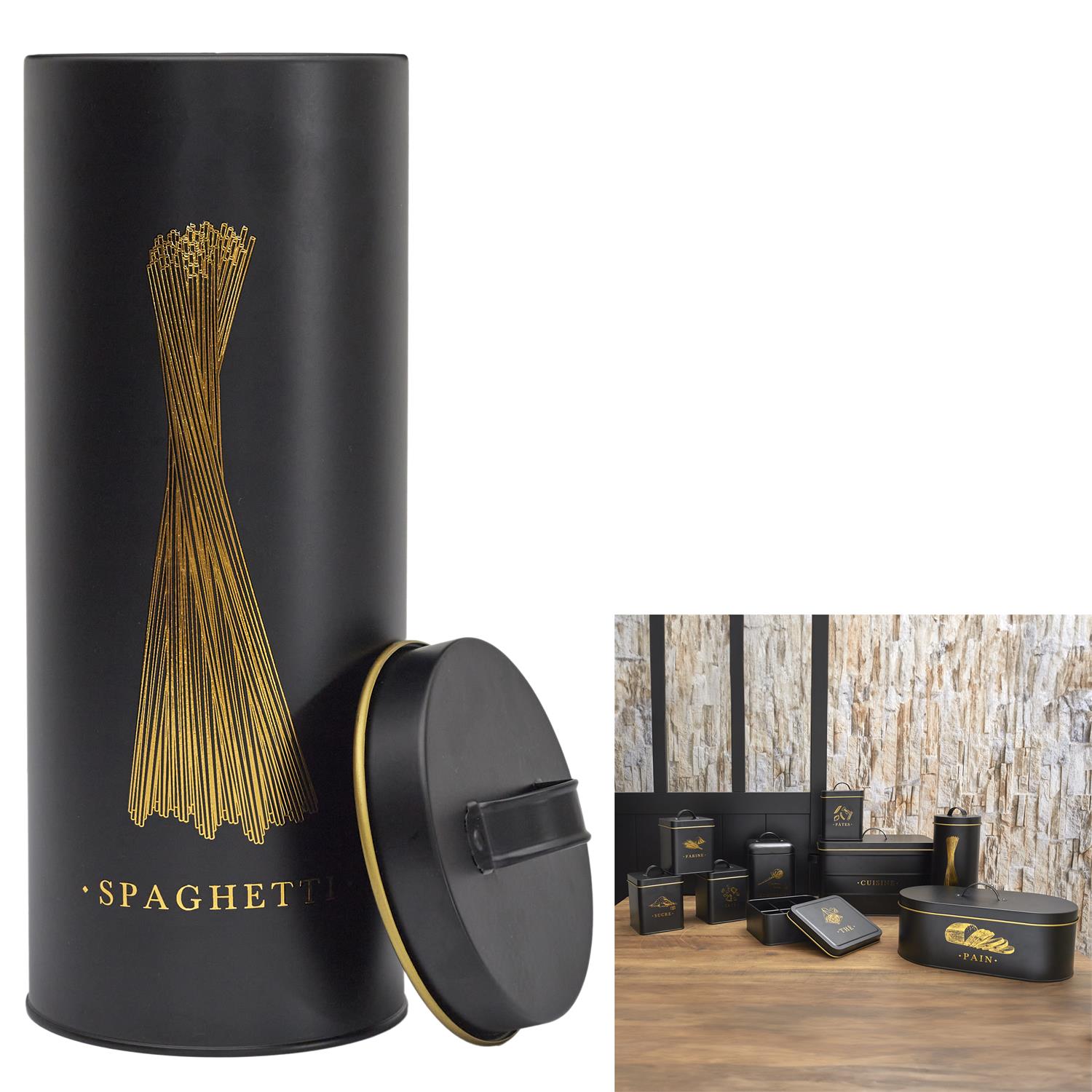 Elegants un praktisks metāla trauks, kas paredzēts spageti un citu garo makaronu uzglabāšanai. Tā slaidā, vertikālā forma ir ideāli piemērota sausajiem produktiem, savukārt matēti melnais pārklājums ar zelta krāsas grafisku spageti ilustrāciju piešķir traukam izteikti greznu un mūsdienīgu raksturu.