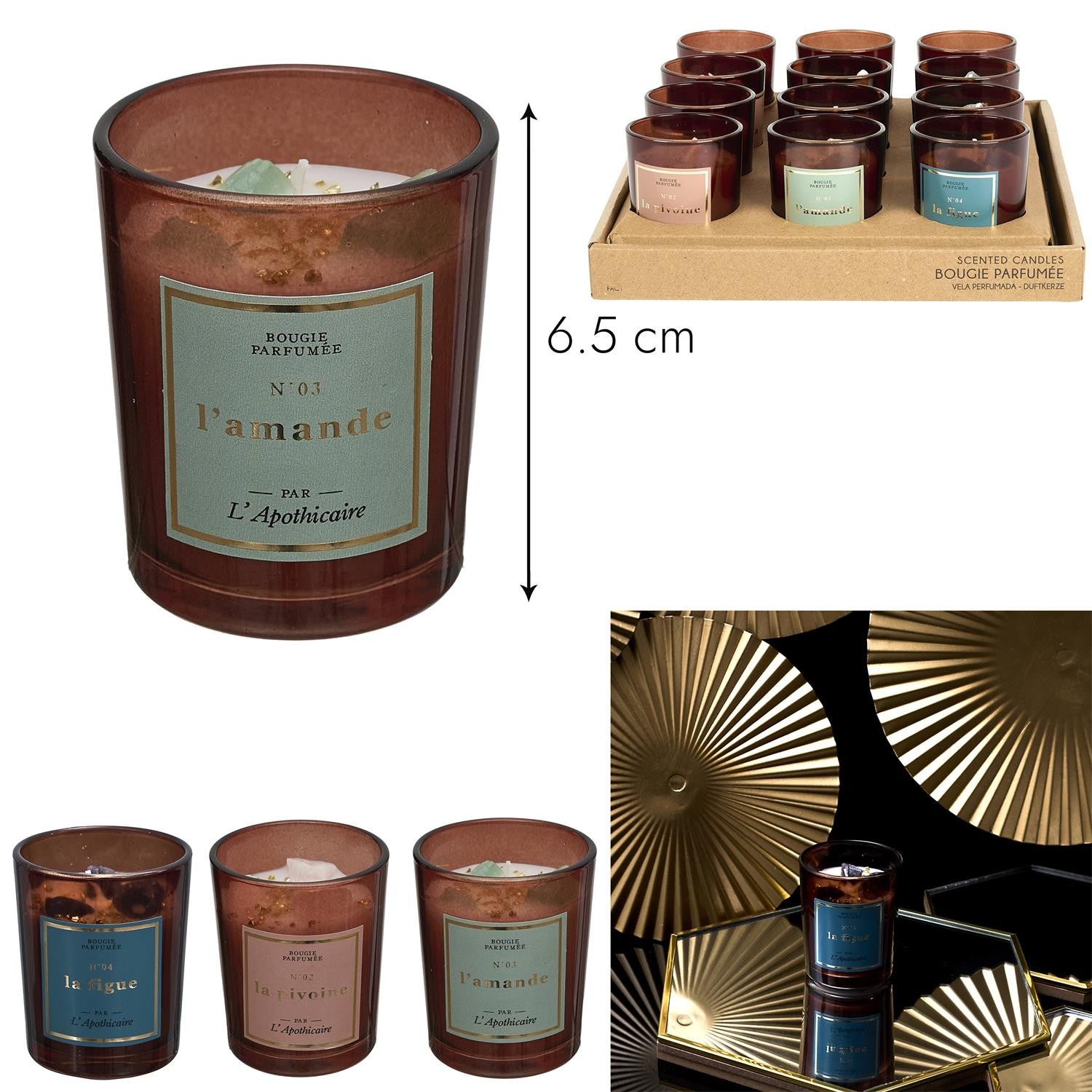 Mini aromātiskā svece ar dekoratīviem akmentiņiem “L’Apothicaire” – 6.5 cm (vairāki aromāti)