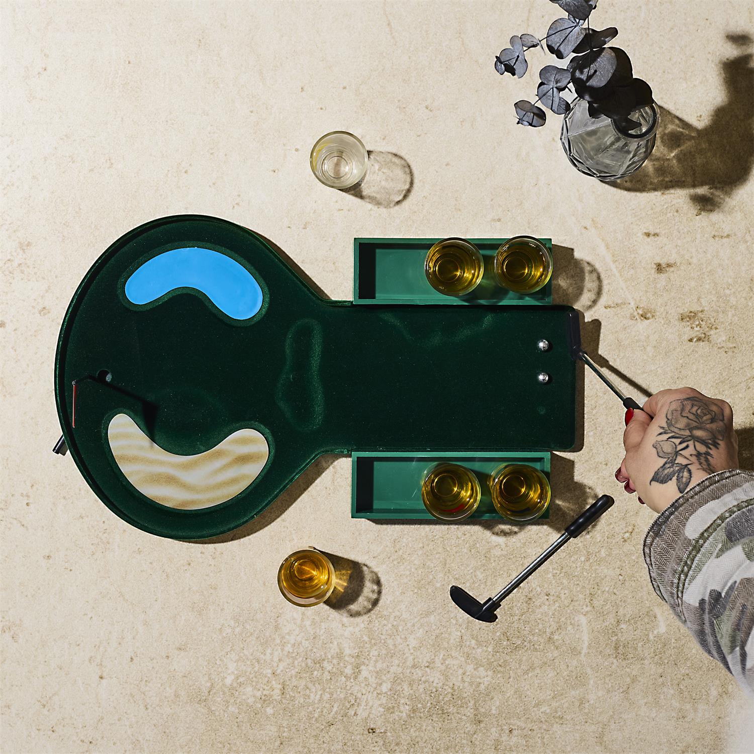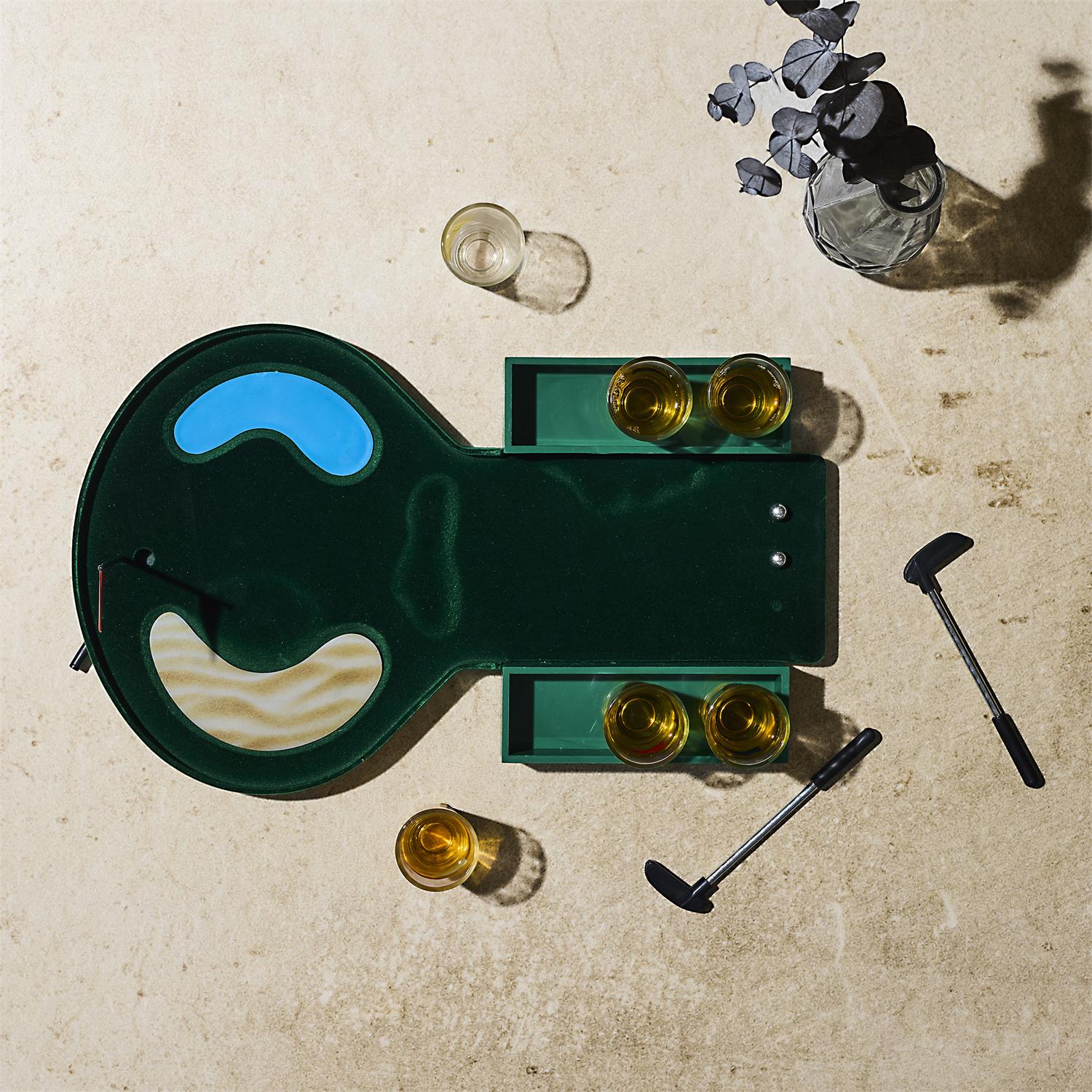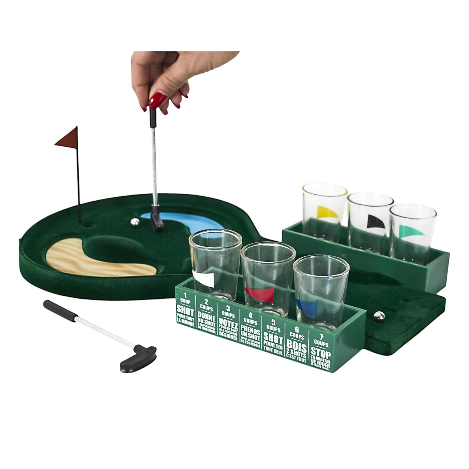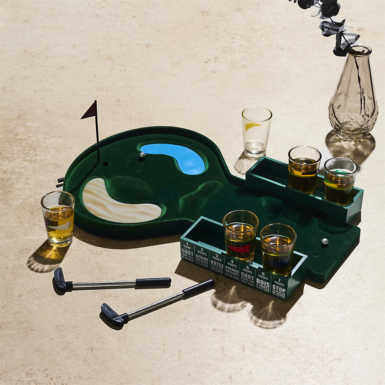 Padari ballīti vēl jautrāku ar šo oriģinālo mini golfa spēli! Komplekts apvieno galda spēli ar šotu glāzītēm, radot lielisku izklaidi draugu kompānijā. Ideāli piemērots dzimšanas dienām, vecmeitu vai vecpuišu ballītēm un jautriem vakariem mājās.