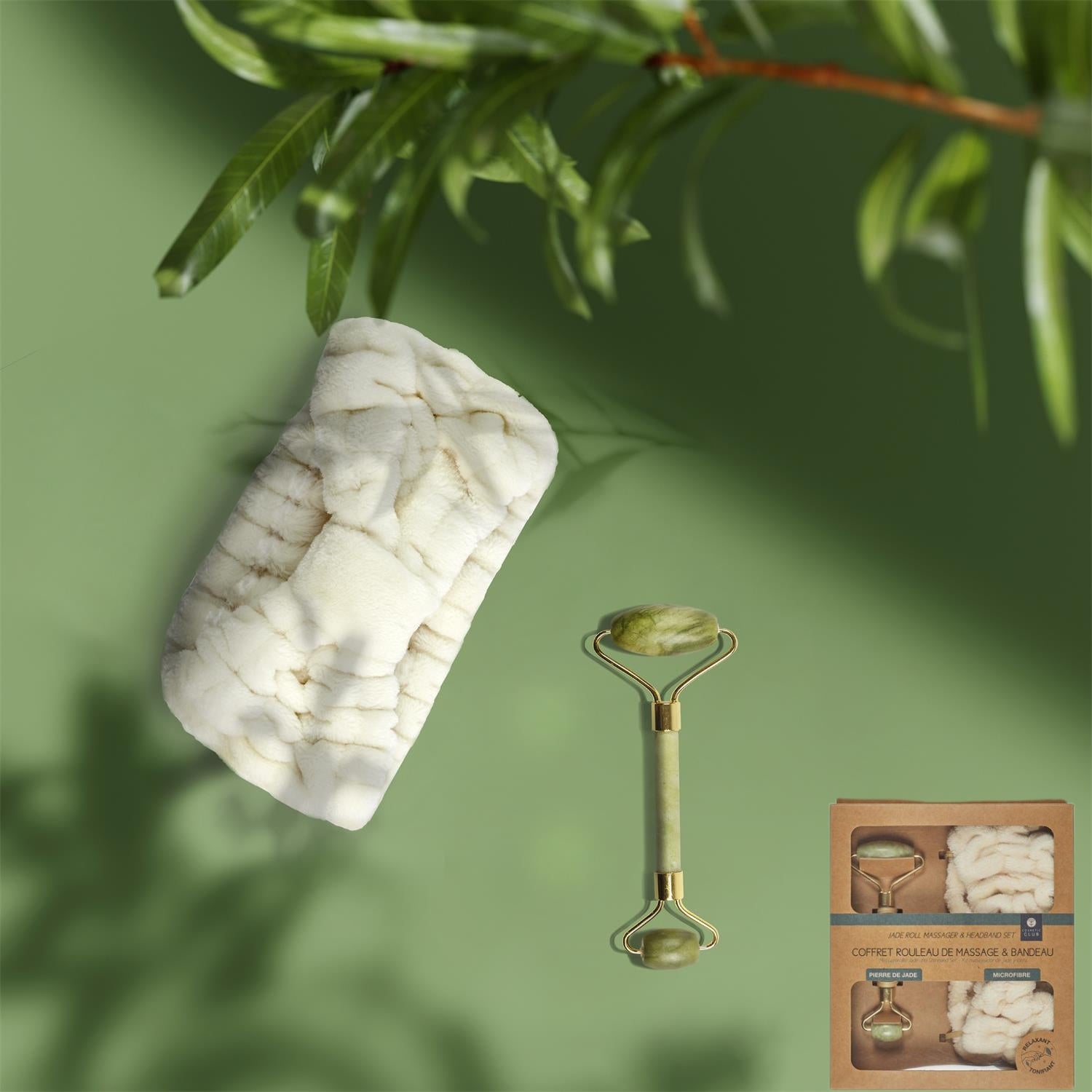 Atklāj sejas kopšanas rituālu ar dabīgā nefrīta masāžas rullīti un īpaši mīkstu kosmētisko galvas saiti. Šis komplekts palīdz uzlabot ādas izskatu, veicina asinsriti un sniedz patīkamu relaksāciju ikdienas skaistumkopšanas laikā.