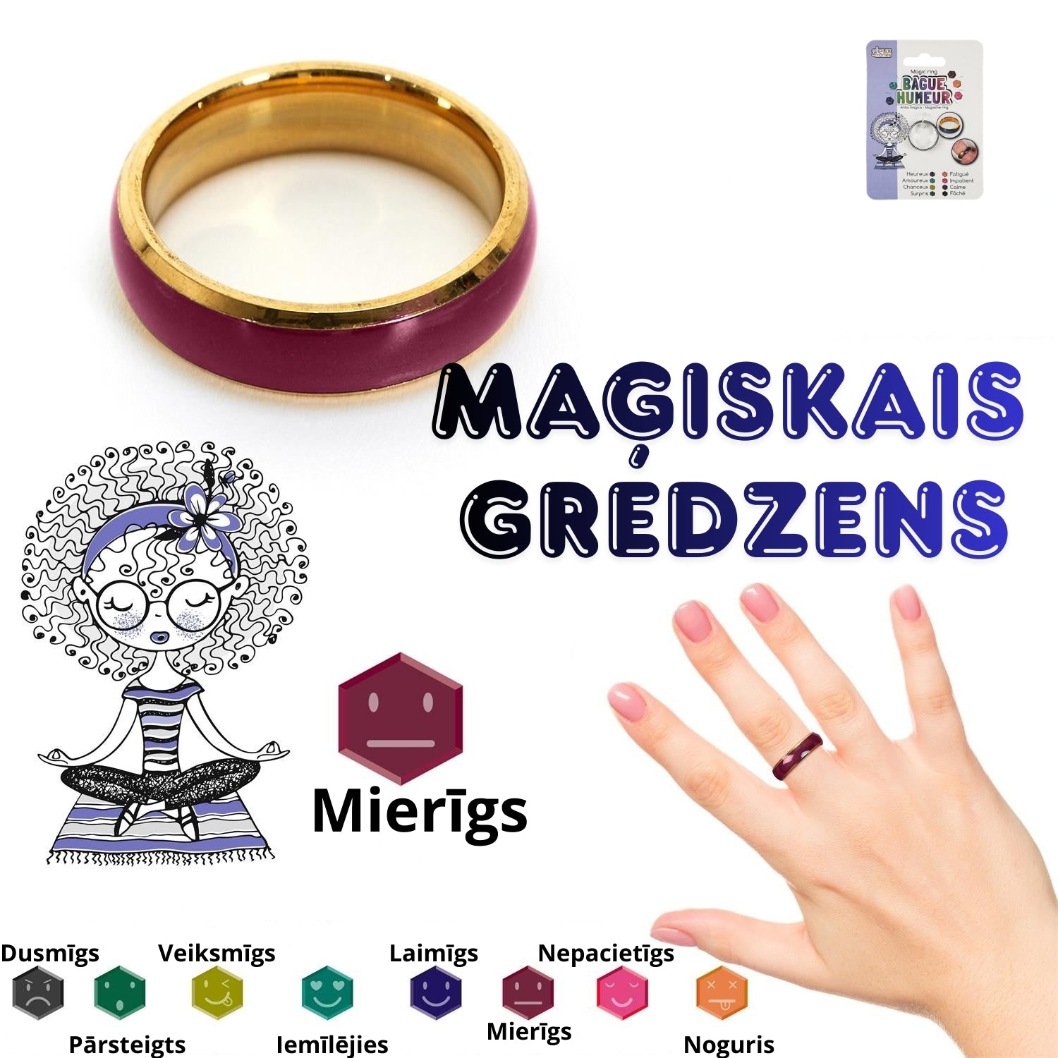Maģisks un aizraujošs noskaņojuma gredzens, kas maina krāsu atkarībā no ķermeņa temperatūras un emocionālā stāvokļa. Katrs krāsas tonis simbolizē konkrētu noskaņojumu – no mierīga un laimīga līdz pārsteigtam vai nogurušam.