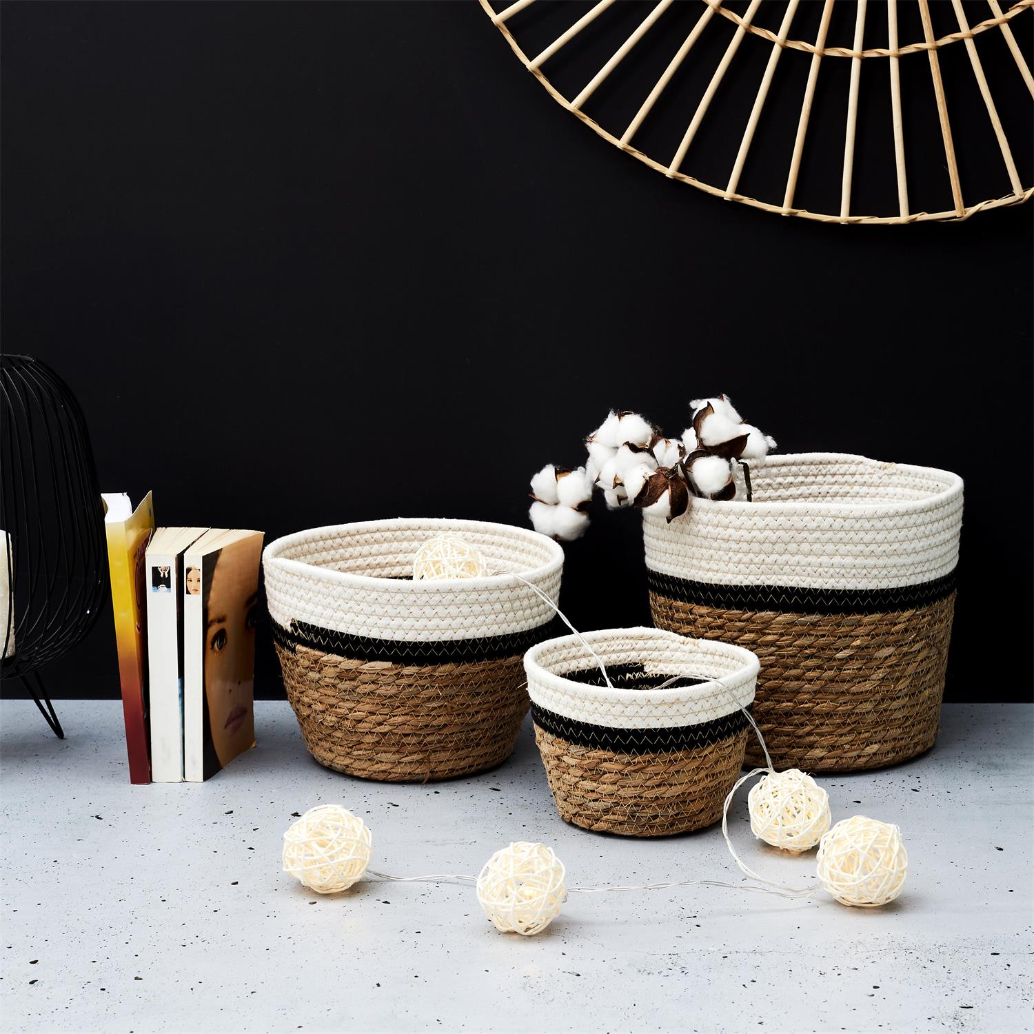 Stilīgs un praktisks pītu grozu komplekts no dabīgām šķiedrām, kas lieliski iederēsies jebkurā interjerā – viesistabā, guļamistabā, bērnistabā vai vannasistabā. Grozi apvieno dabisku tekstūru ar modernu dizainu baltā un melnā krāsu joslā, piešķirot telpai mājīgumu un kārtību.