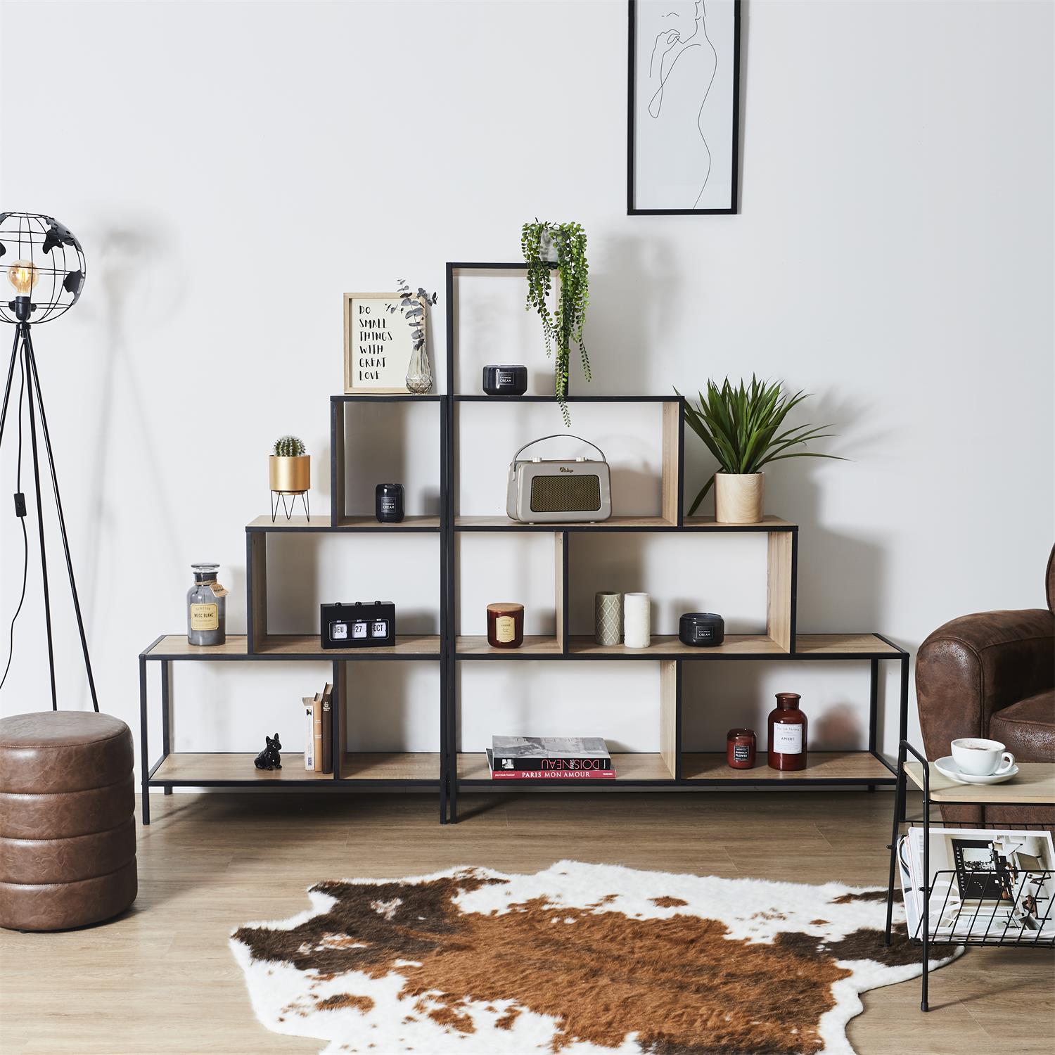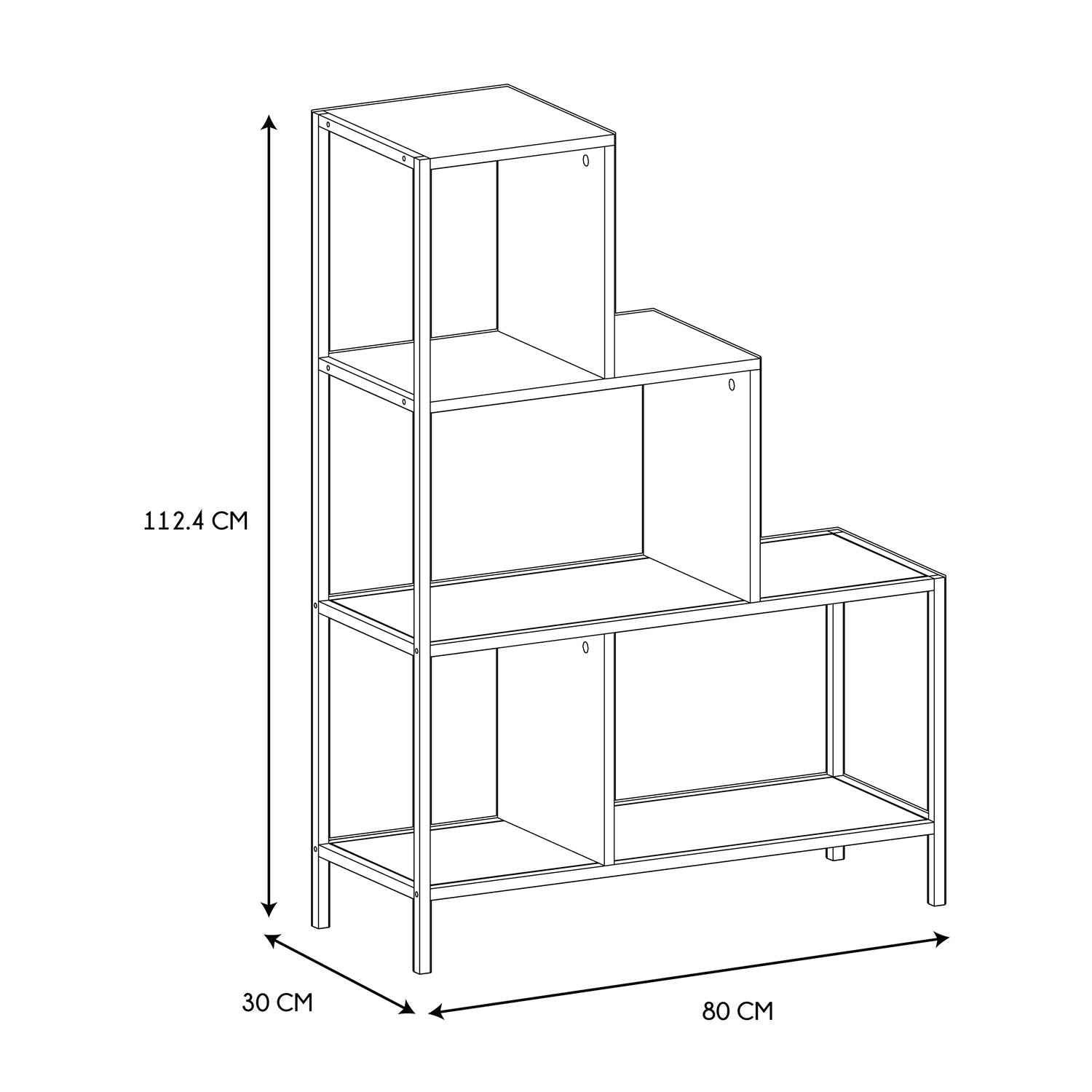 Mūsdienīgs un funkcionāls plaukts industriālā stilā, kas apvieno melnu metāla konstrukciju ar siltu koka imitācijas apdari. Asimetriskais dizains piešķir interjeram dinamiku un ļauj radoši izvietot grāmatas, dekorus, augus vai interjera aksesuārus.