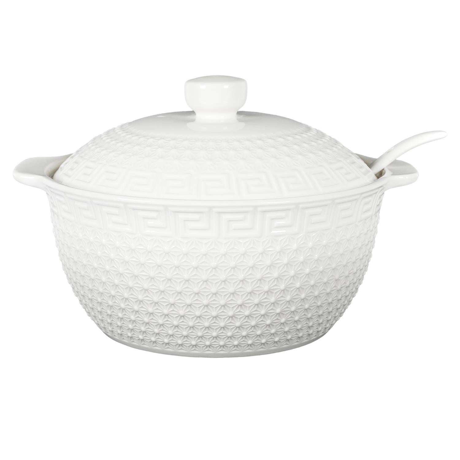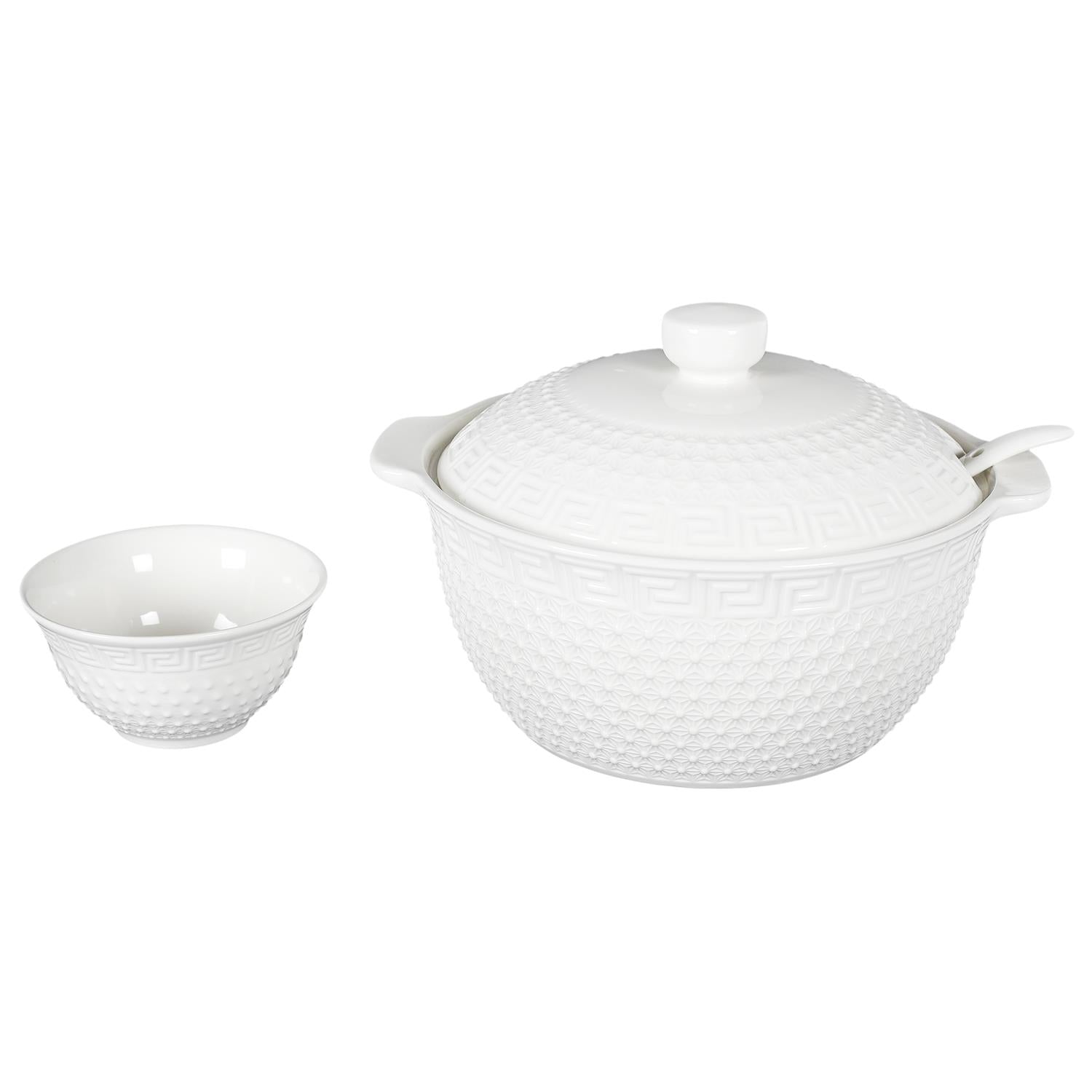 Elegants porcelāna zupas servēšanas komplekts, kas apvieno klasisku dizainu ar praktisku funkcionalitāti. Komplektā ietilpst zupas terīne ar vāku, kausiņš, bļodiņas un kauss, veidojot pilnvērtīgu un saskaņotu galda pasniegšanas risinājumu ikdienai un svētkiem.