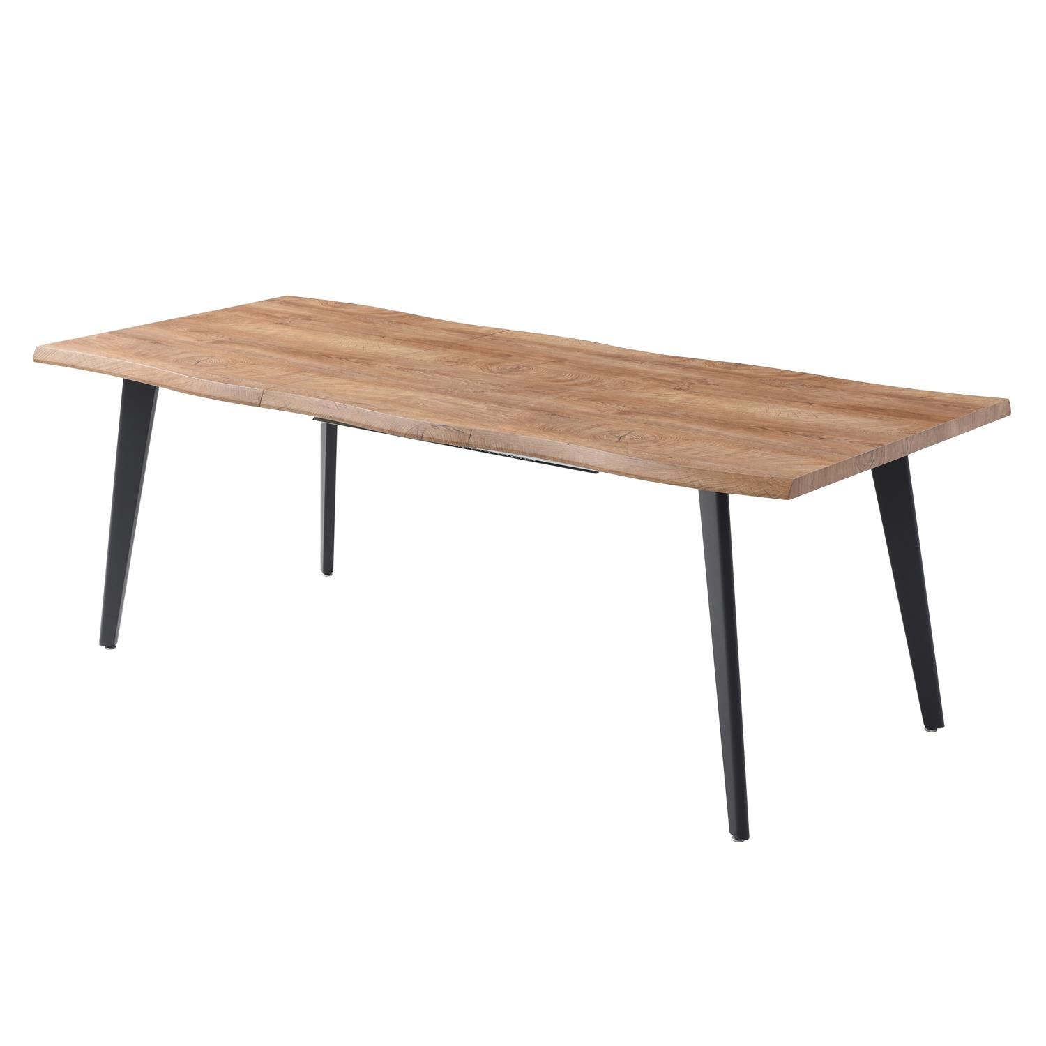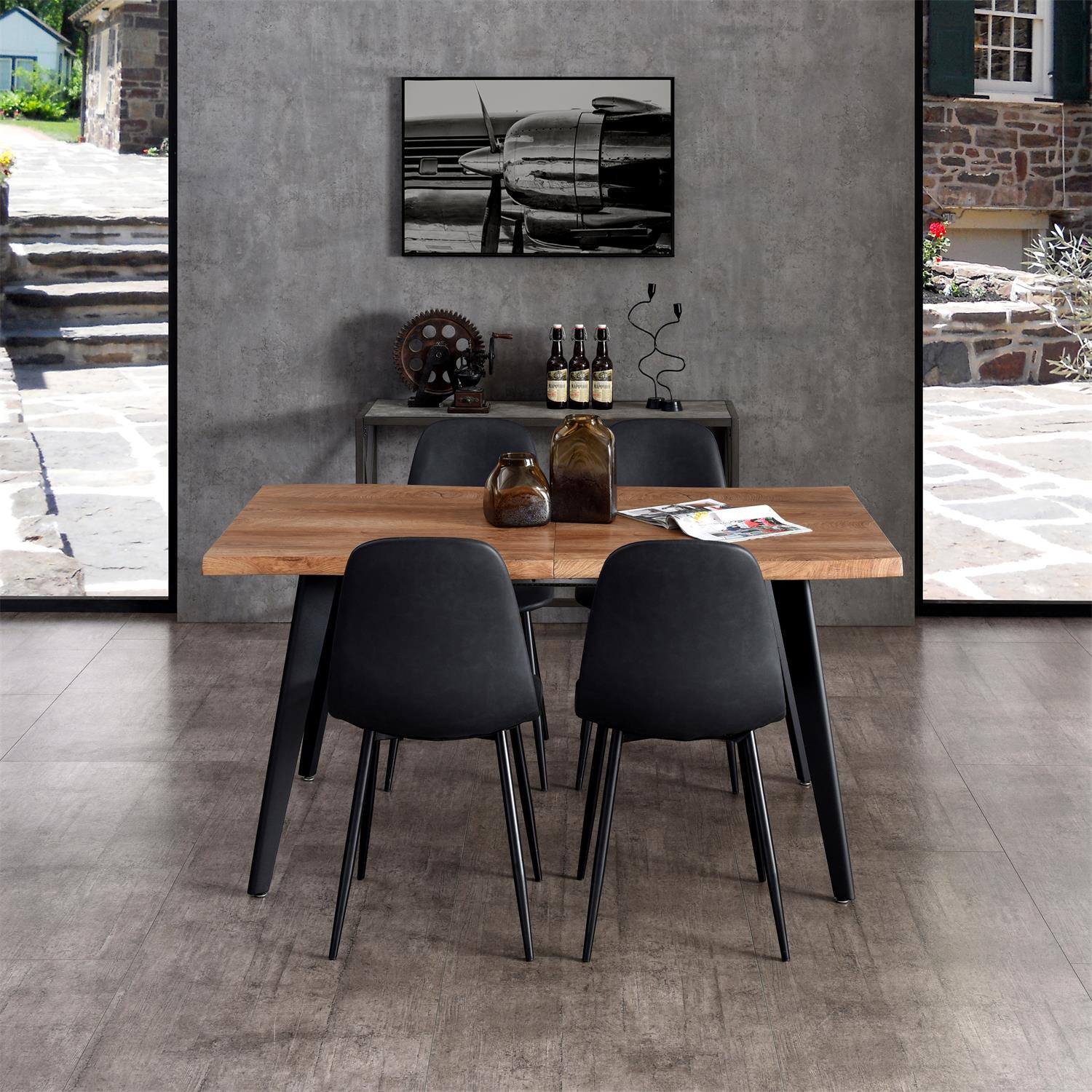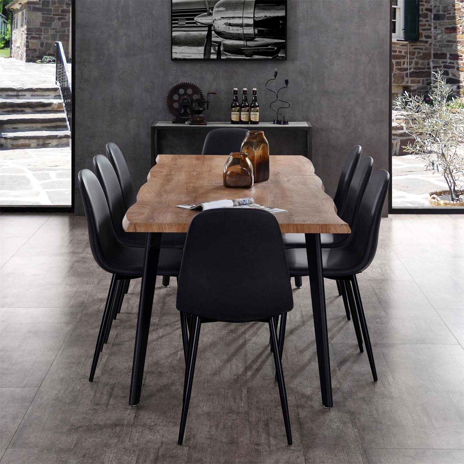 Elegants un funkcionāls pusdienu galds ar dabīga koka efektu, kas piešķir telpai siltumu un mūsdienīgu raksturu. Galdvirsmai ir organiska viļņota mala, kas imitē dabīga koka formu, savukārt melnās metāla kājas nodrošina stabilitāti un industriālu akcentu.
