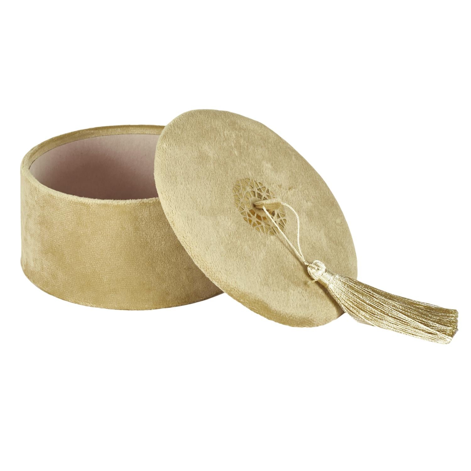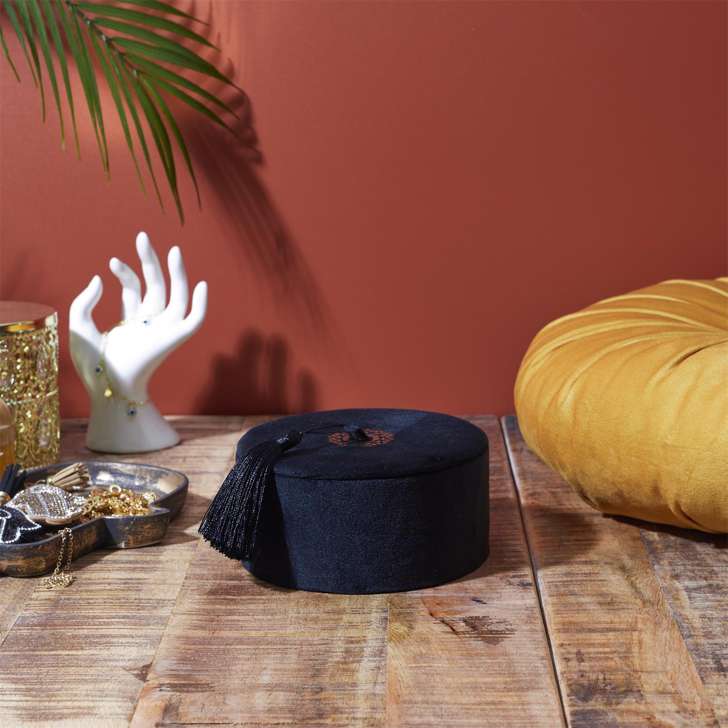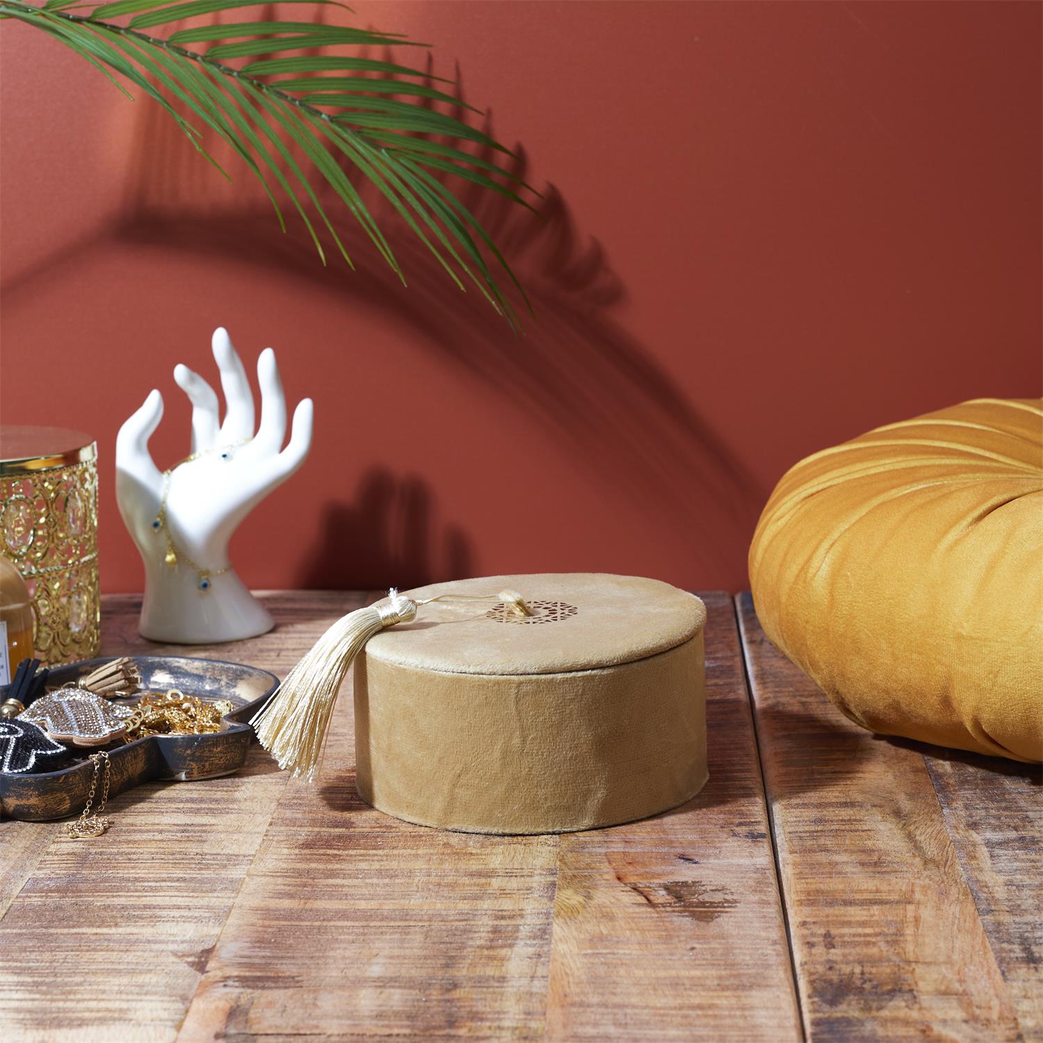 Eleganta samta kastīte ar noņemamu vāku un dekoratīvu pušķīti ir stilīgs akcents gan interjeram, gan praktiskai lietu glabāšanai. Maigais samta audums piešķir greznuma sajūtu, savukārt zelta krāsas detaļas un pušķītis rada izsmalcinātu, nedaudz bohemisku noskaņu.