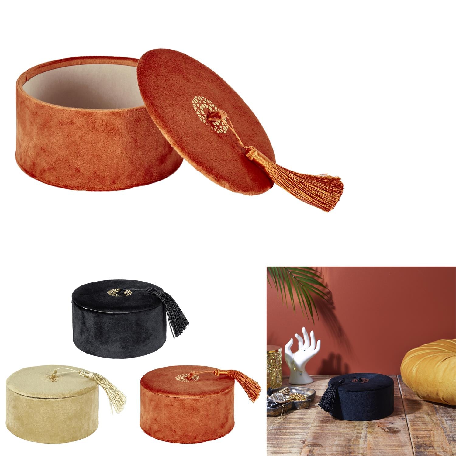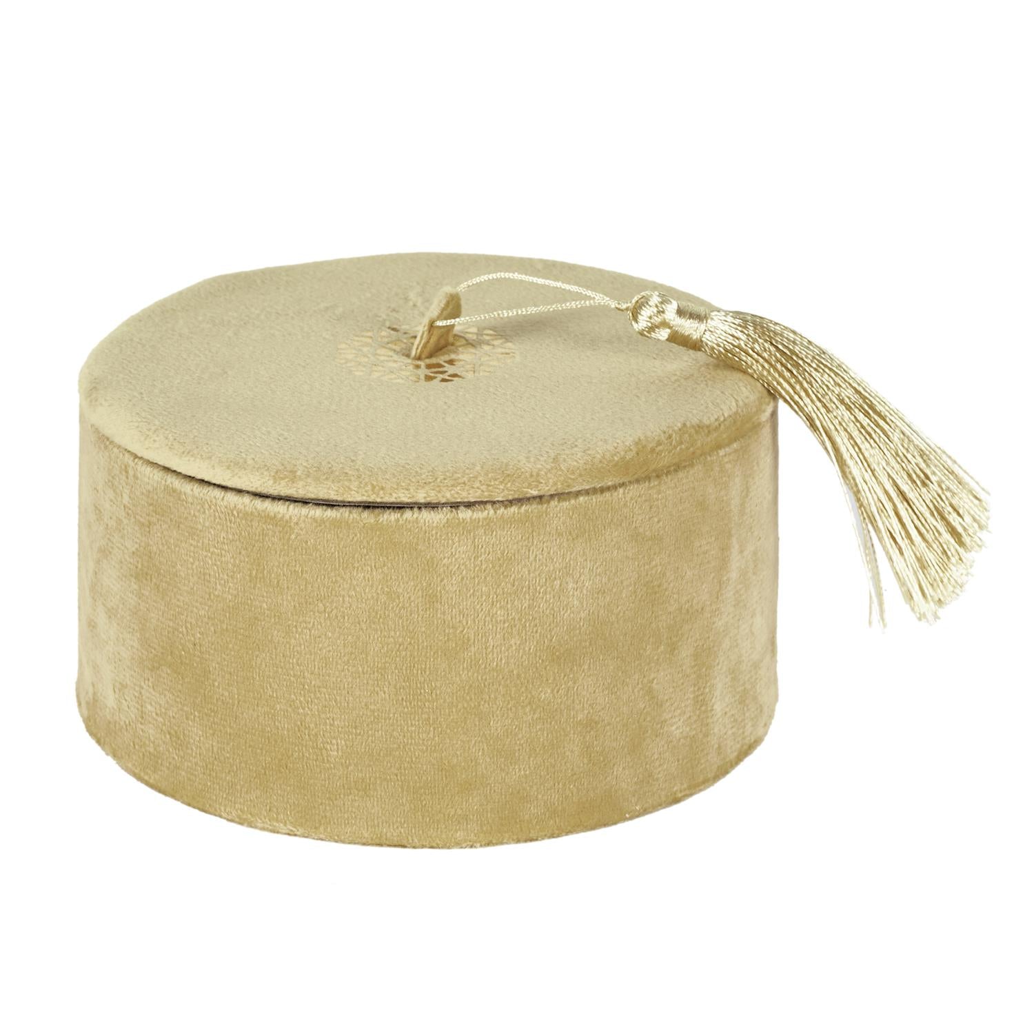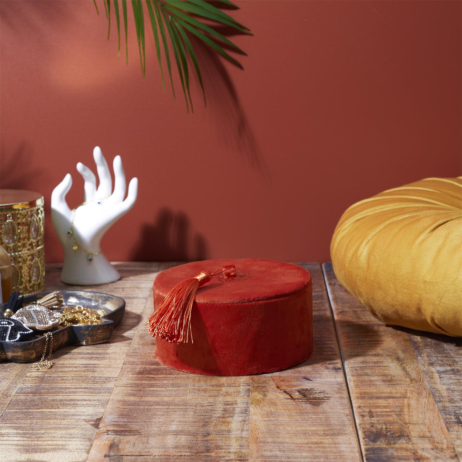Eleganta samta kastīte ar noņemamu vāku un dekoratīvu pušķīti ir stilīgs akcents gan interjeram, gan praktiskai lietu glabāšanai. Maigais samta audums piešķir greznuma sajūtu, savukārt zelta krāsas detaļas un pušķītis rada izsmalcinātu, nedaudz bohemisku noskaņu.
