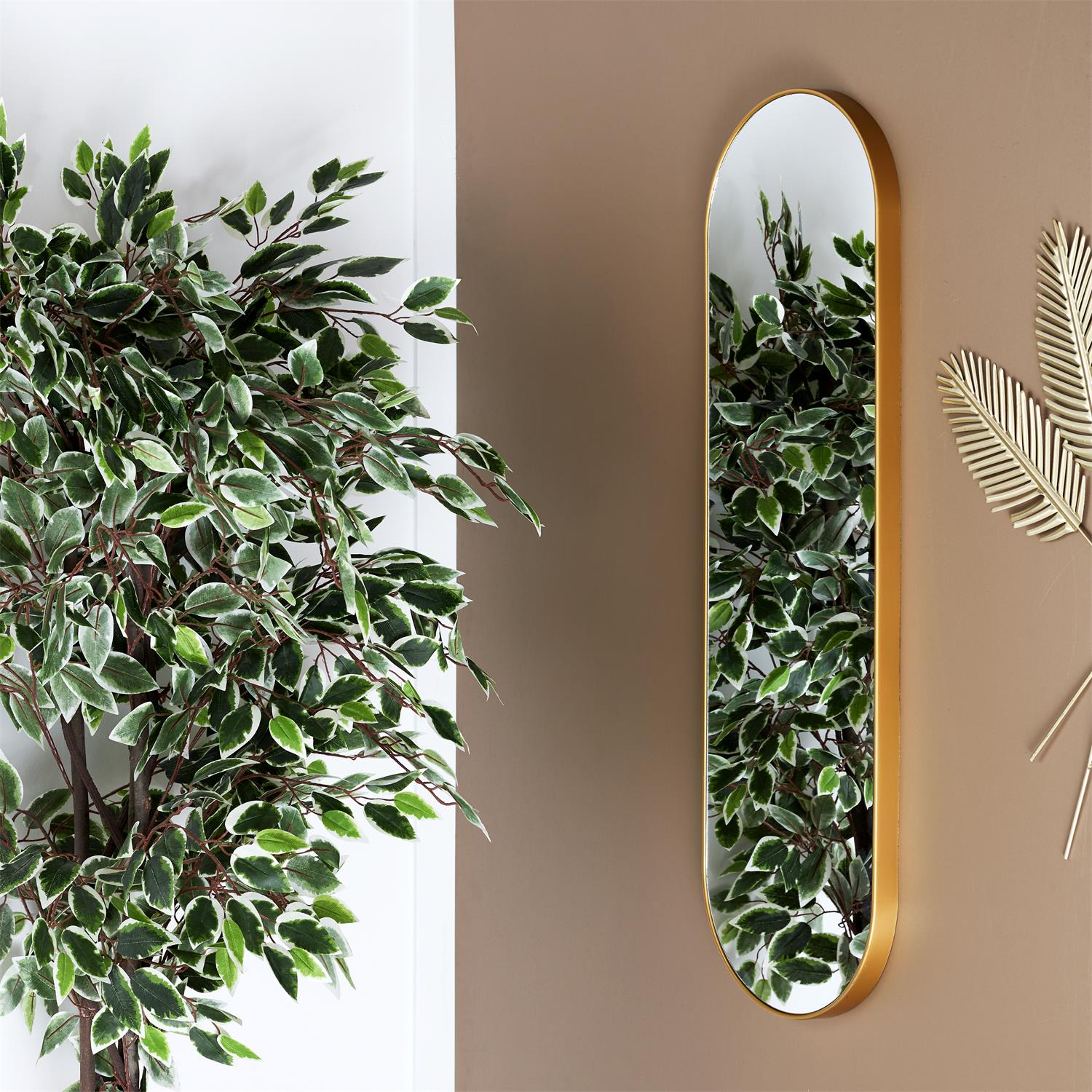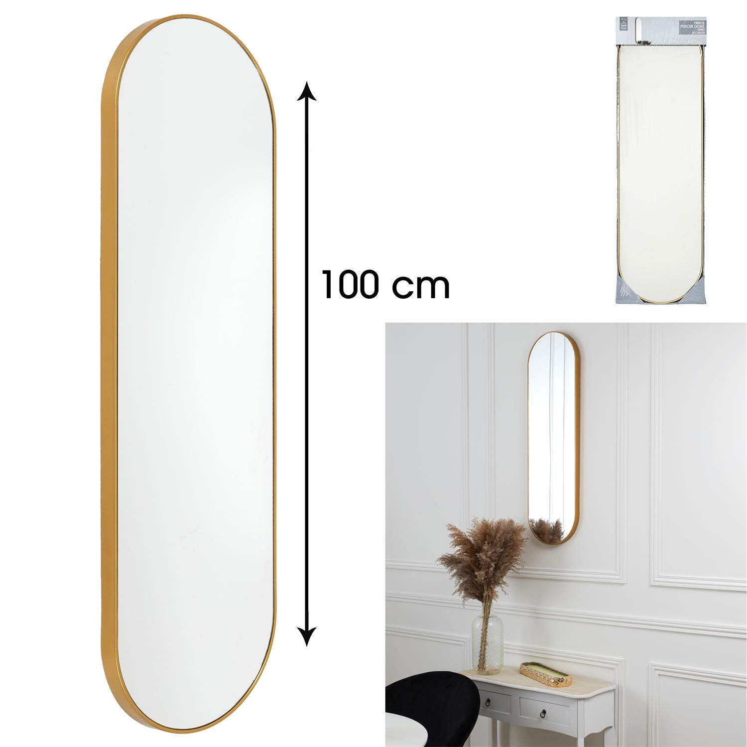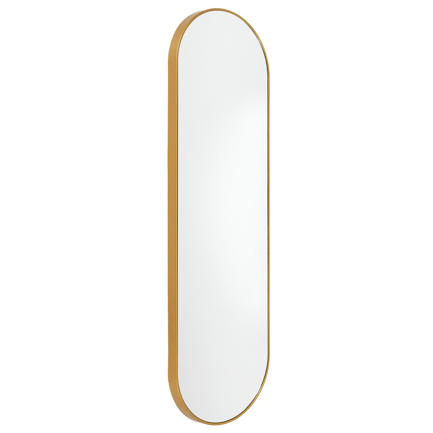 Elegants, vertikāls sienas spogulis ar metāla zelta rāmi, kas piešķir interjeram vieglumu un izsmalcinātu akcentu. Tīrā, noapaļotā forma vizuāli pagarina telpu un lieliski iederas gan modernā, gan klasiskā interjerā.