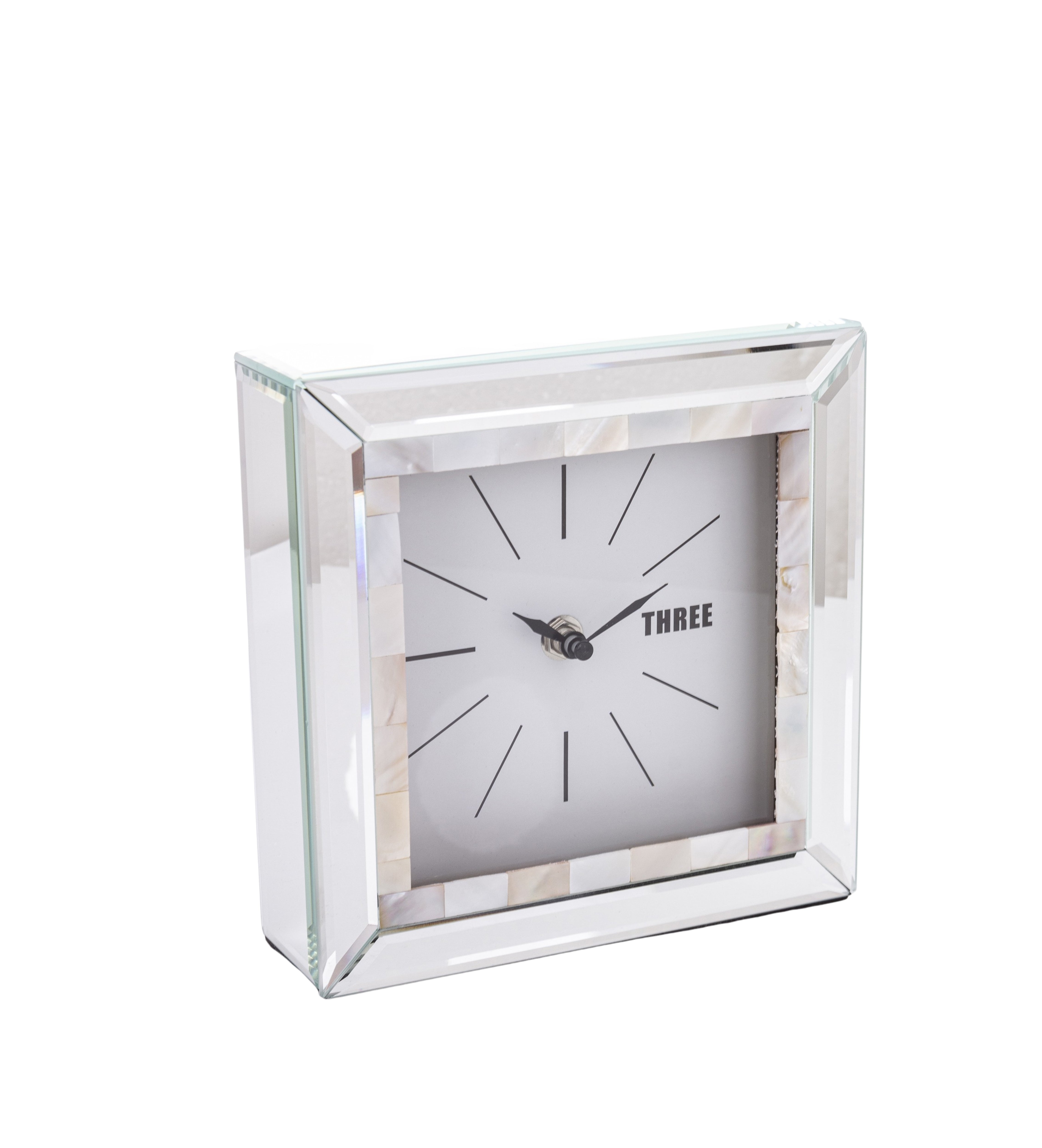 Šis spoguļstikla galda pulkstenis apvieno mūsdienīgu dizainu ar izsmalcinātu eleganci. Kvadrātveida forma, slīpēta stikla malas un perlamutra akcenti rada greznu vizuālo efektu, kas lieliski papildina gan modernu, gan klasisku interjeru.