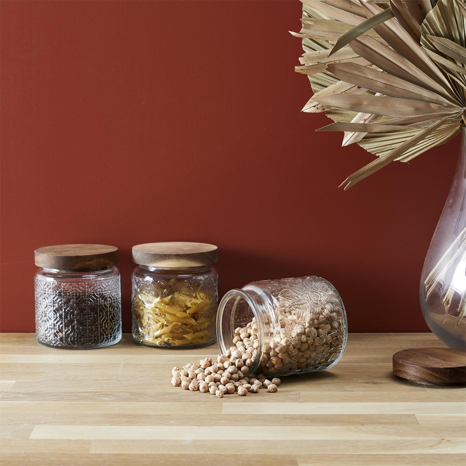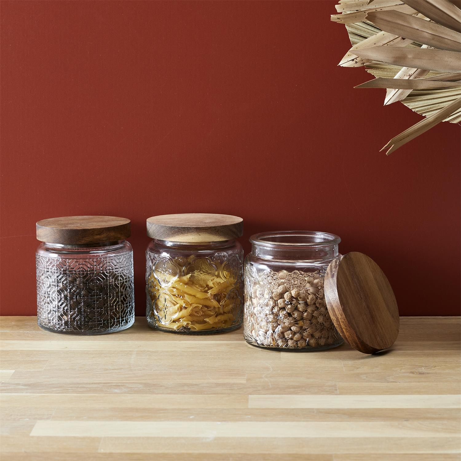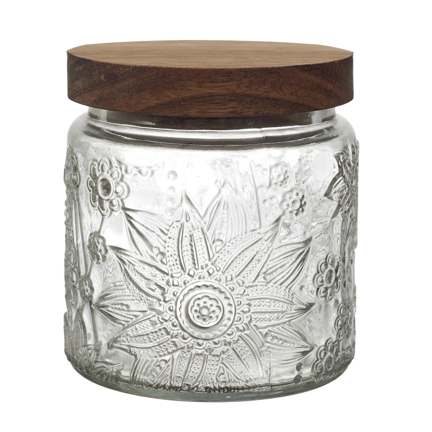 Eleganta stikla burciņa ar dekoratīvu reljefu un dabīga koka vāku, kas apvieno funkcionalitāti ar estētisku dizainu. Smalkais raksts piešķir burciņai izteiksmīgu raksturu, savukārt koka vāks rada siltu, dabisku akcentu, kas lieliski iederas gan modernā, gan klasiskā virtuvē.