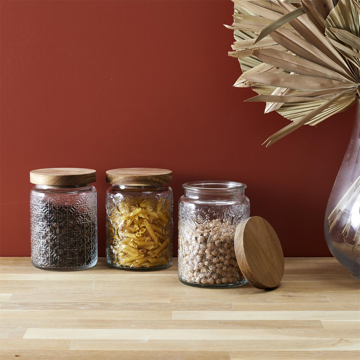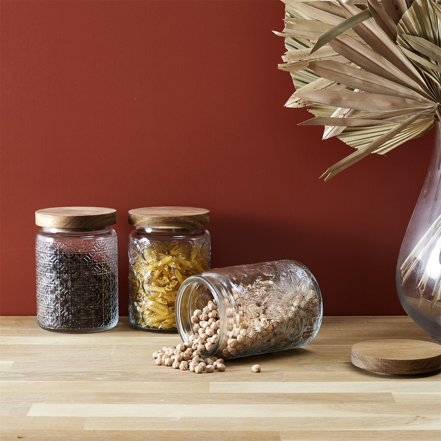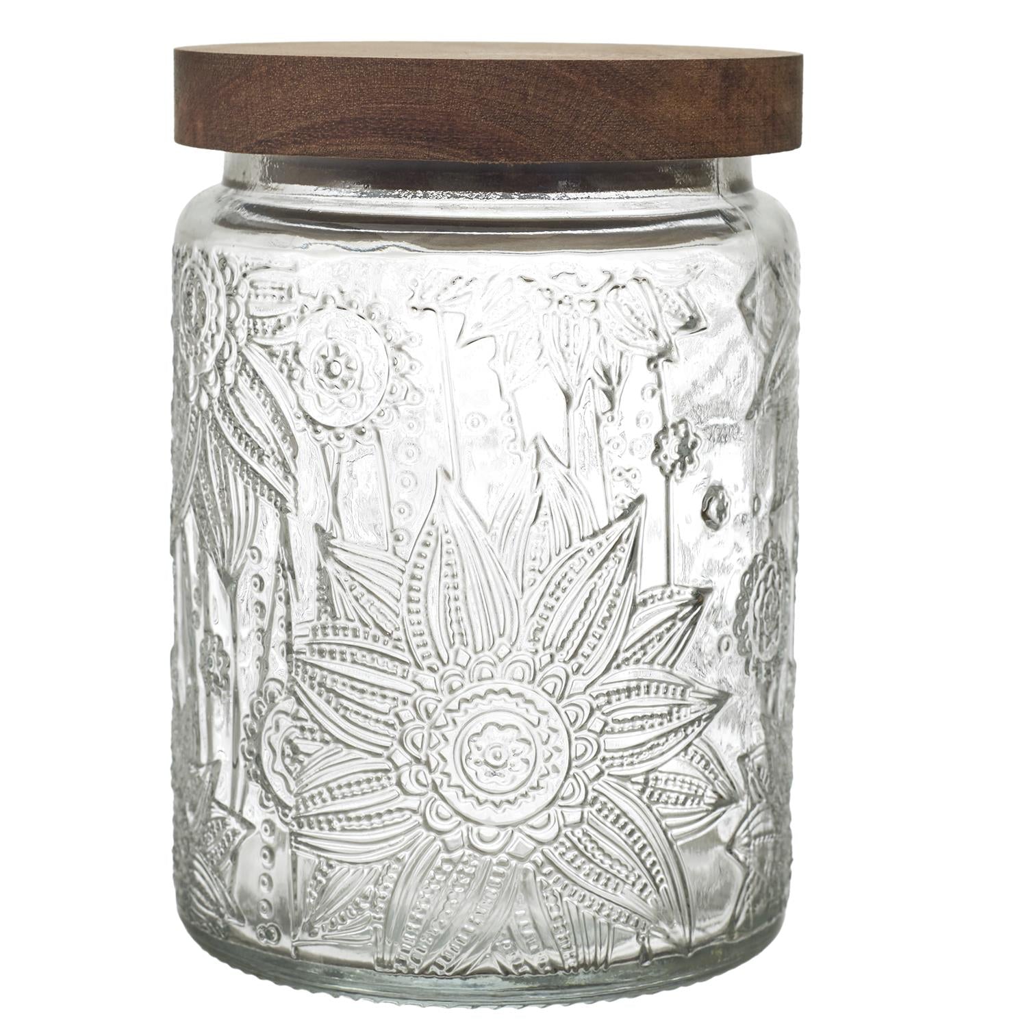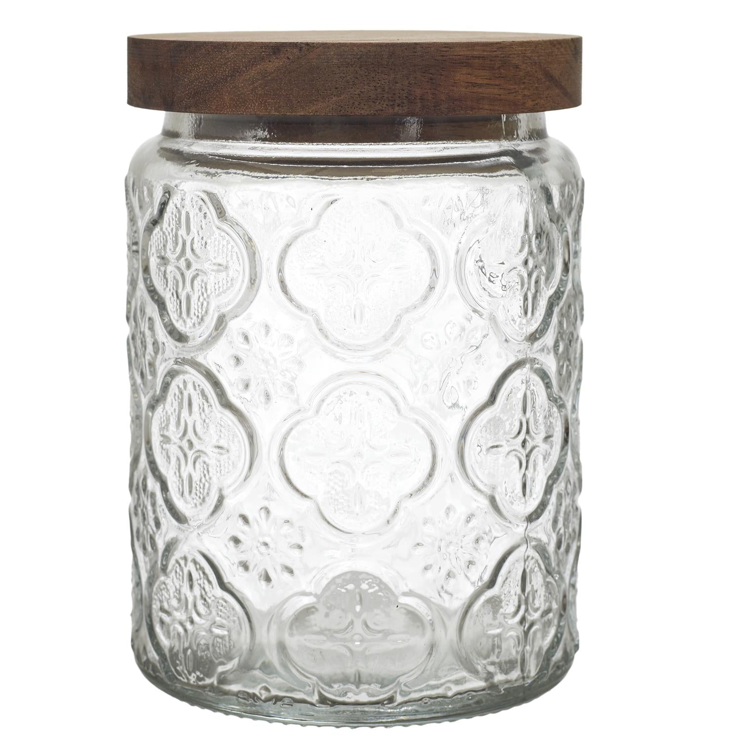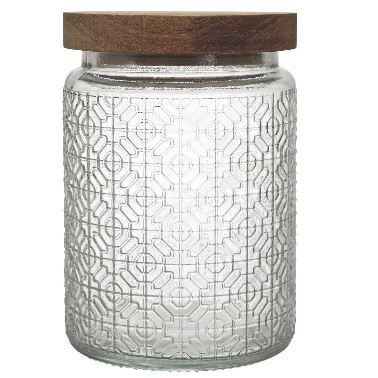 Eleganta stikla burciņa ar dekoratīvu reljefu un dabīga koka vāku, kas apvieno funkcionalitāti ar estētisku dizainu. Smalkais raksts piešķir burciņai izteiksmīgu raksturu, savukārt koka vāks rada siltu, dabisku akcentu, kas lieliski iederas gan modernā, gan klasiskā virtuvē.
