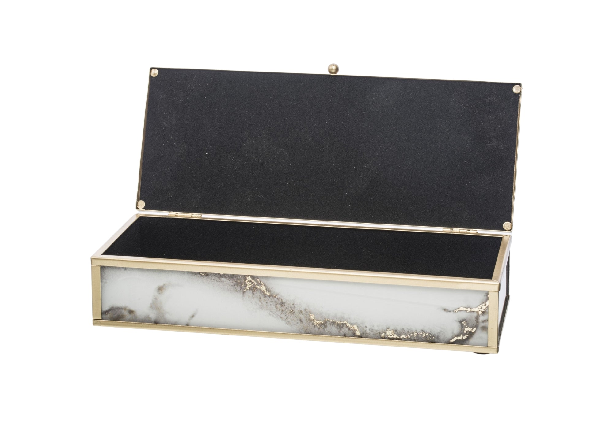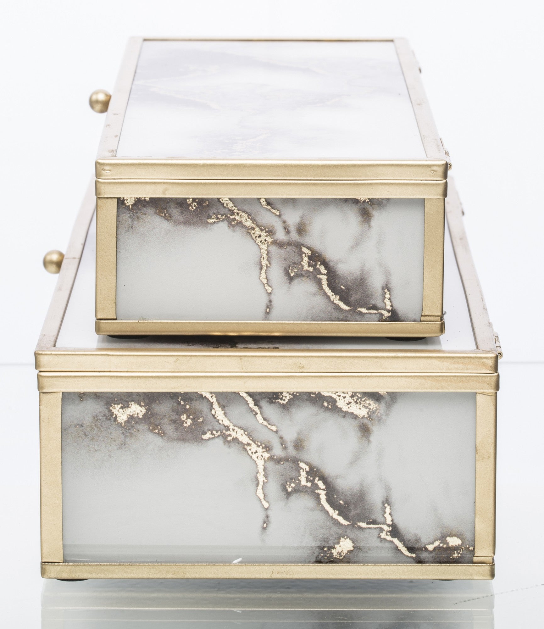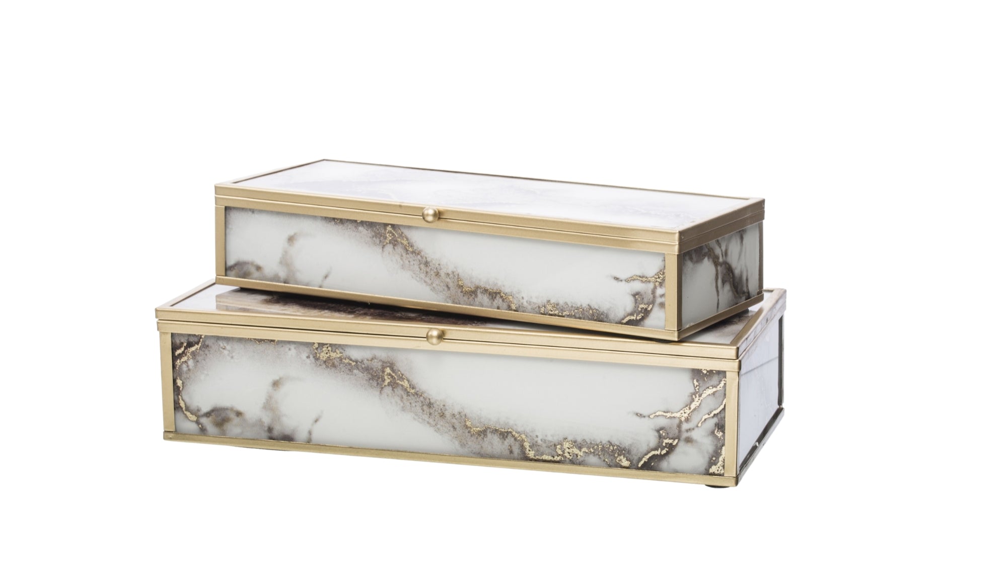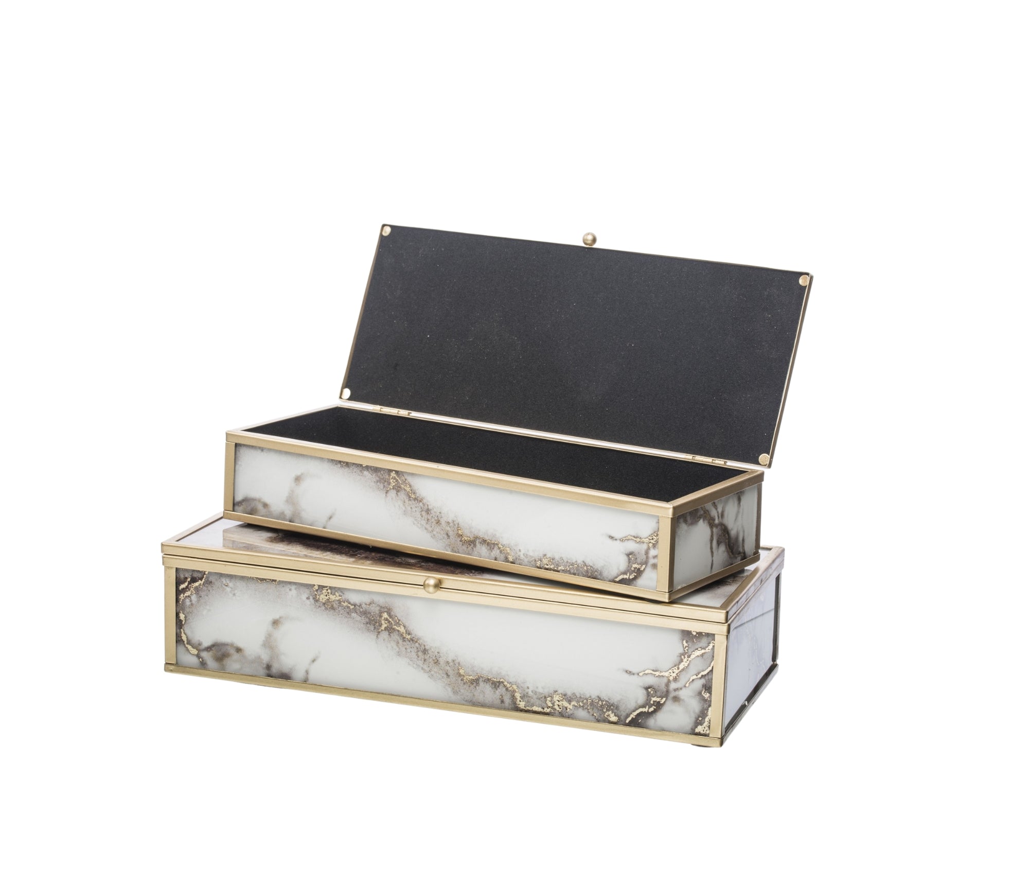 Elegants stikla kastīšu komplekts ar zelta metāla rāmi, kas apvieno greznu dizainu un praktisku lietojumu. Marmora efekta stikls ar smalkiem zelta akcentiem piešķir izsmalcinātību, savukārt samta iekšpuse pasargā rotaslietas un sīkus aksesuārus no skrāpējumiem.