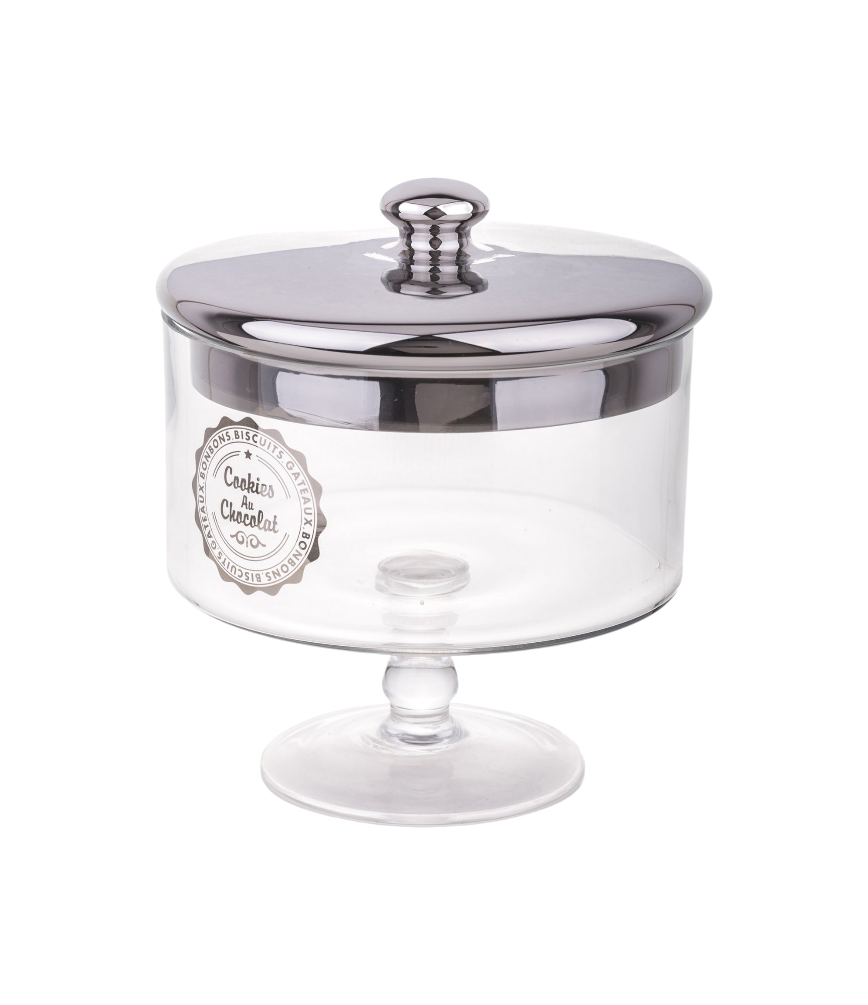 Elegants stikla trauks uz kājas ar sudraba krāsas vāku, kas piešķir galdam klasisku un izsmalcinātu noskaņu. Caurspīdīgais stikls ļauj skaisti izcelt trauka saturu, savukārt vāks palīdz saglabāt saldumu vai uzkodu svaigumu.