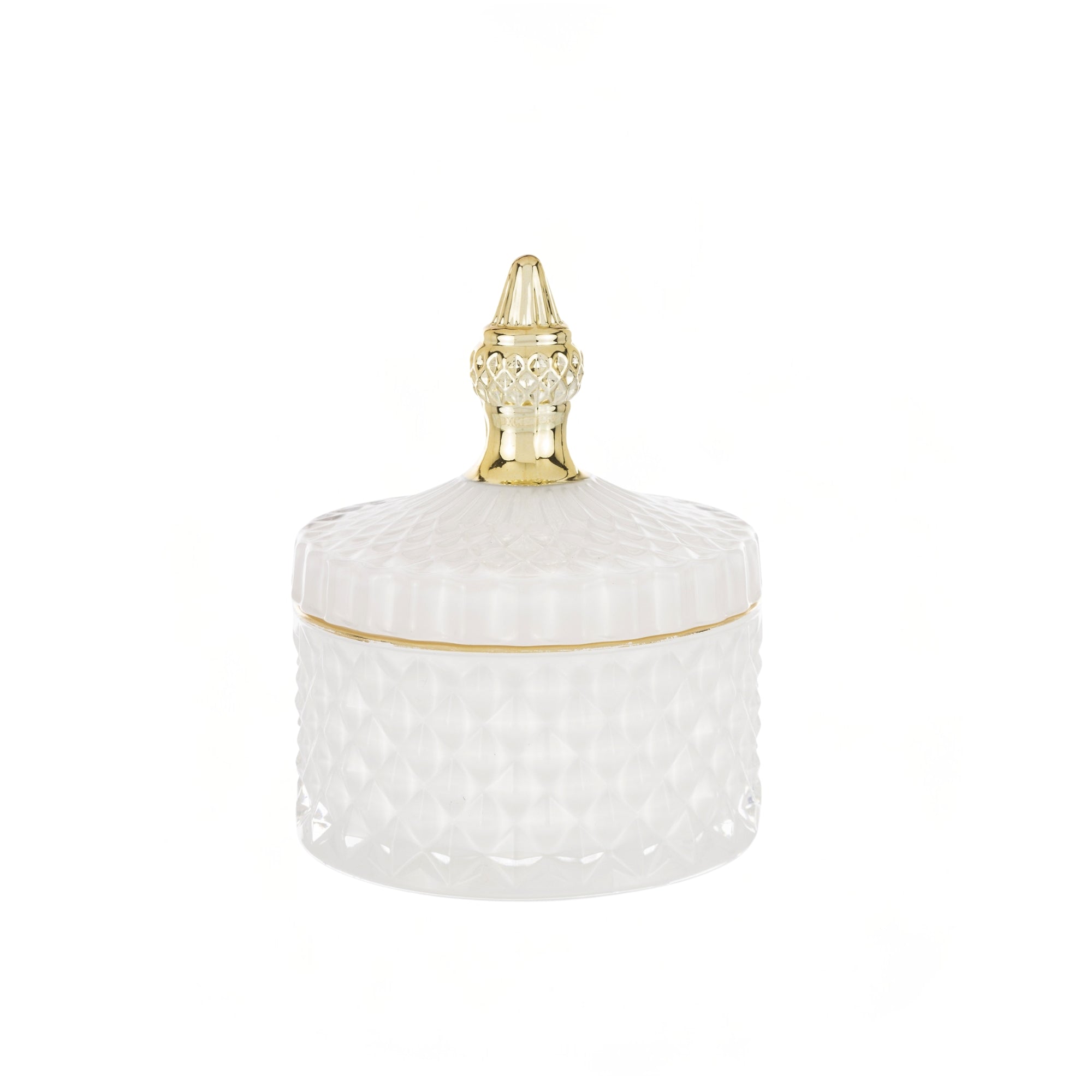 Izsmalcināts dekoratīvs stikla trauciņš ar vāku, kas izceļas ar bagātīgu reljefa rakstu un spīdīgu baltas krāsas apdari. Klasiskā forma apvienojumā ar greznu tekstūru piešķir traukam luksusa noskaņu un padara to par izteiksmīgu interjera akcentu.