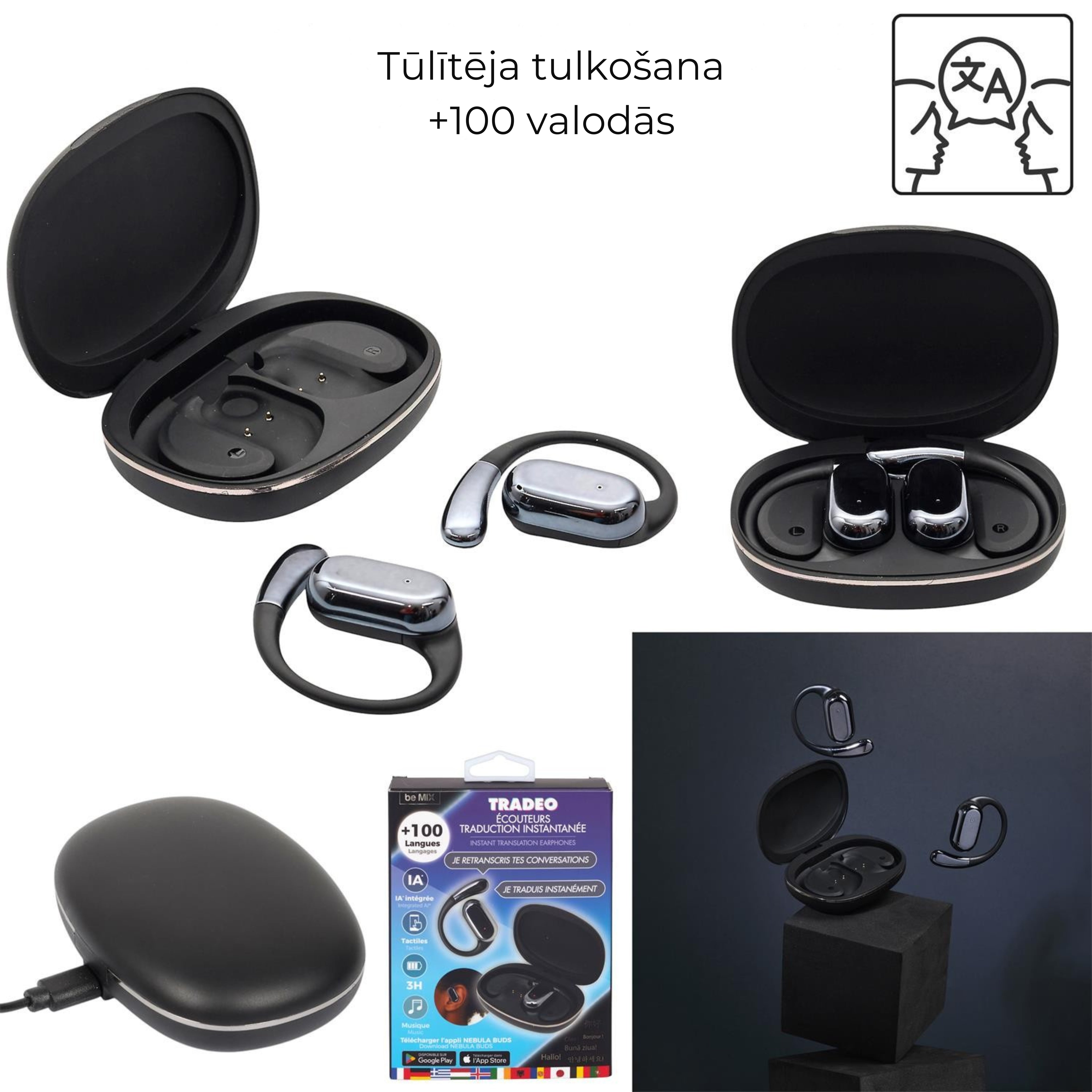 TRADEO M12 ir inovatīvas bezvadu austiņas ar tūlītējas tulkošanas funkciju, kas ļauj saprasties vairāk nekā 100 valodās reāllaikā. Ideāli ceļojumiem, biznesa tikšanām, mācībām un ikdienas sarunām ar cilvēkiem no visas pasaules.