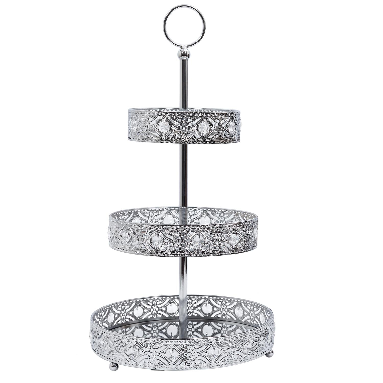 Izsmalcināts un grezns trīslīmeņu dekoratīvais stends, kas izceļas ar filigrānu metāla rakstu un spoguļotām paplātēm. Tas piešķir telpai luksusa noskaņu un ir ideāls gan servēšanai, gan dekorēšanai.