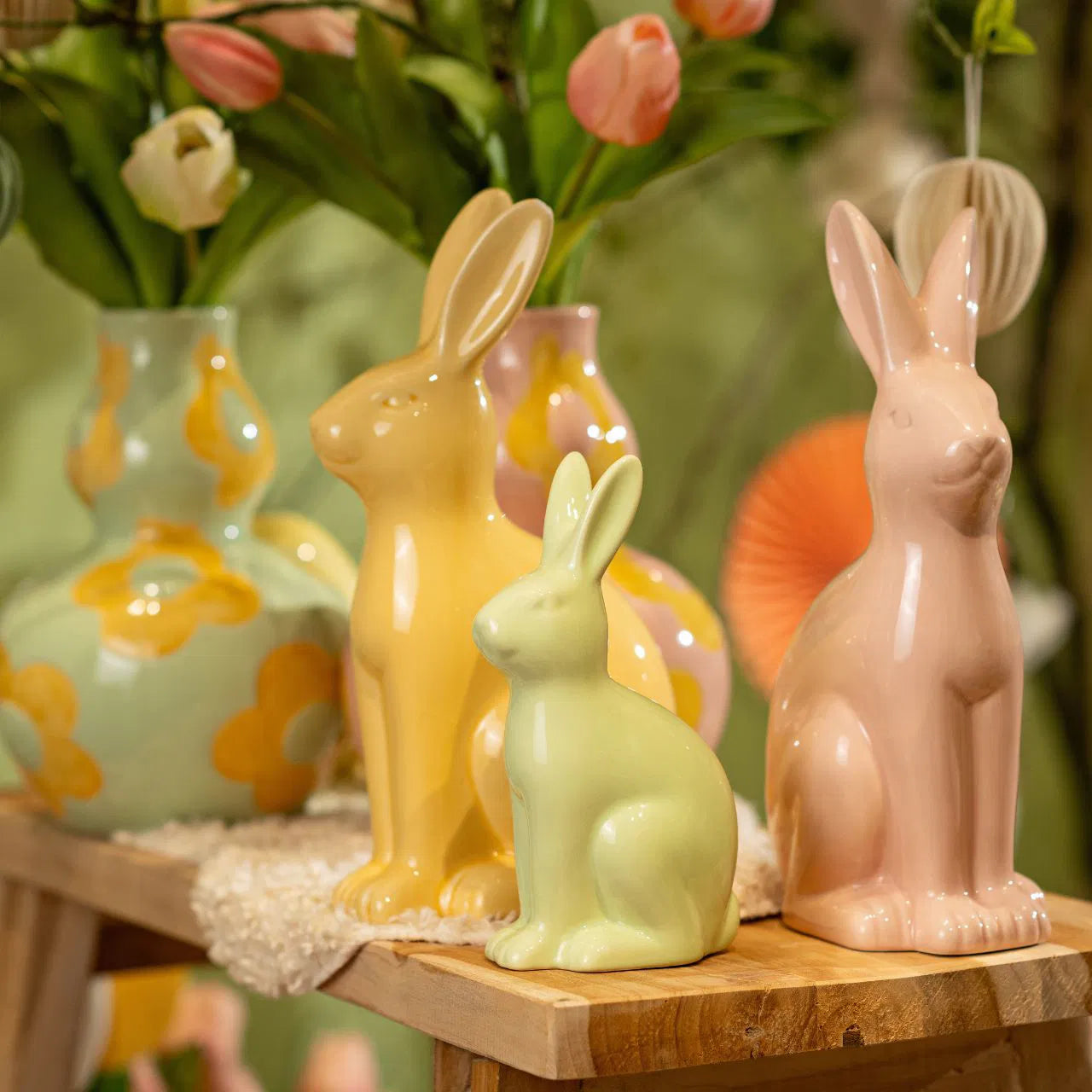 Spilgts un pavasarīgs zaļš keramikas zaķis, kas ienes interjerā svaigumu un Lieldienu noskaņu. Glancētā apdare piešķir figūrai elegantu spīdumu, savukārt maigi zaļais tonis lieliski saskan ar pavasara ziediem un sezonālām kompozīcijām.
