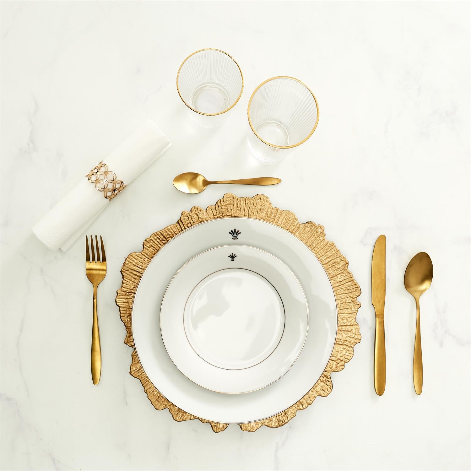 Piešķiriet savam galda klājumam greznu un modernu akcentu ar šo dekoratīvo zelta paliktni šķīvjiem. Elegantā, reljefainā maliņa un spīdīgā zelta krāsa rada svinīgu noskaņu gan ikdienas maltītēm, gan īpašiem pasākumiem – dzimšanas dienām, kāzām, Ziemassvētkiem vai vakariņām draugu lokā.