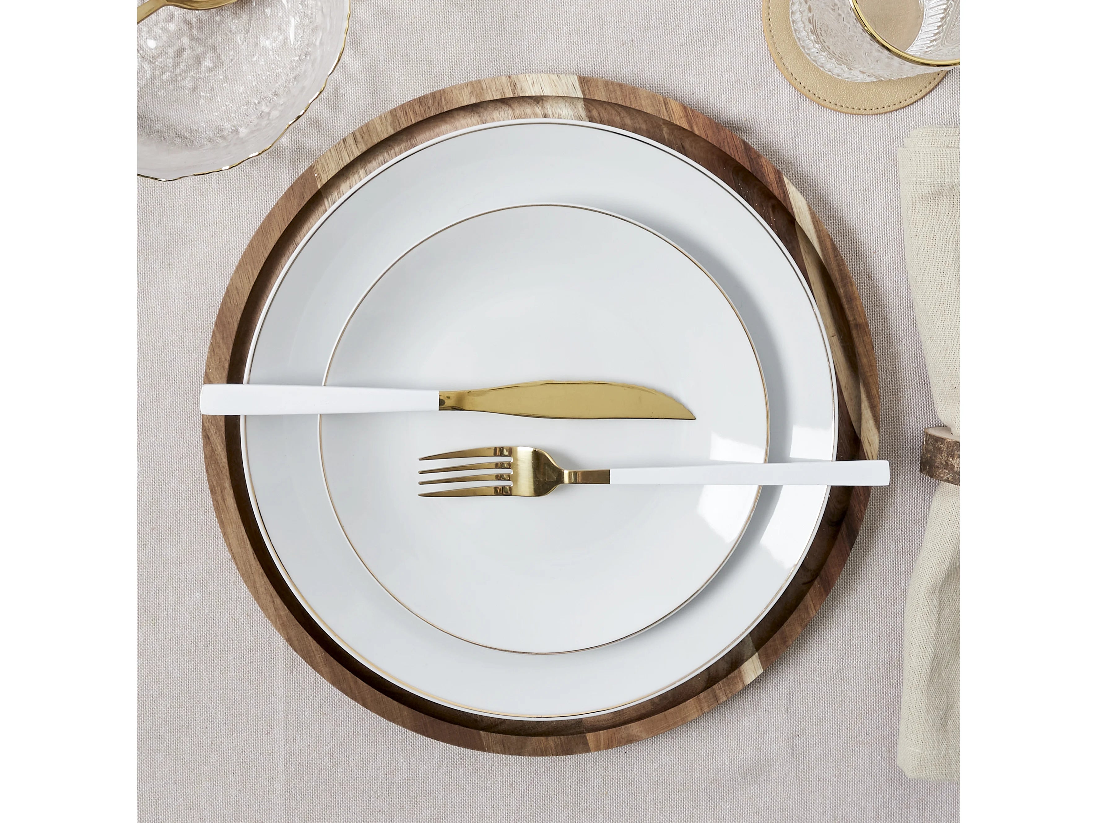 Elegants un mūsdienīgs 16 daļu galda piederumu komplekts, kas piešķir galda klājumam greznu un stilīgu noskaņu. Zelta krāsas metāla darba daļa harmoniski apvienota ar baltiem, minimālistiskiem rokturiem, radot izsmalcinātu dizainu gan ikdienai, gan svētku reizēm.