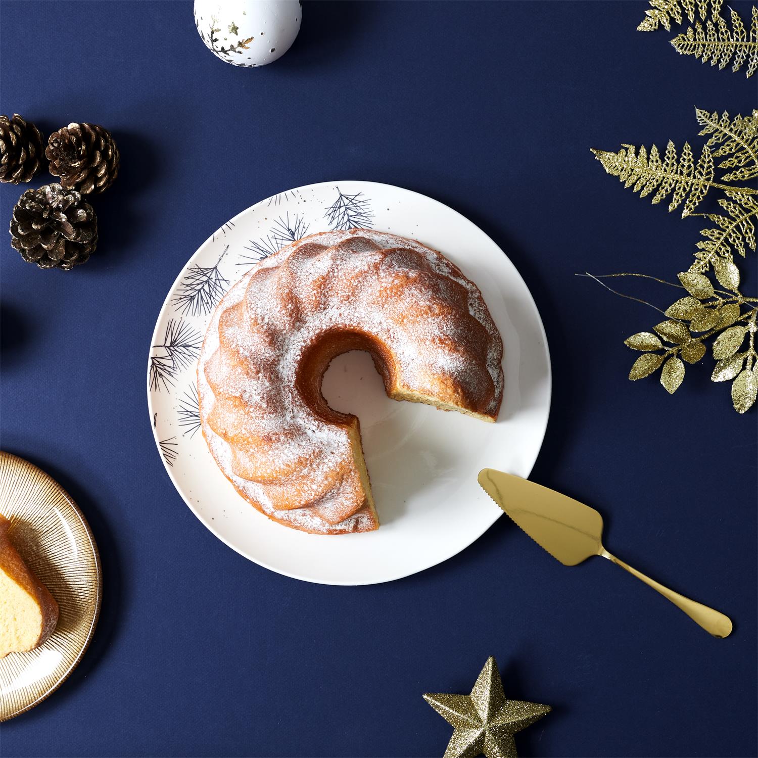 Eleganta un praktiska zelta krāsas kūkas lāpstiņa, kas paredzēta kūku, pīrāgu un tartu vieglai sagriešanai un servēšanai. Tās smalkais dizains piešķir galdam greznu akcentu, savukārt funkcionālā forma nodrošina ērtu lietošanu ikdienā un svētkos.