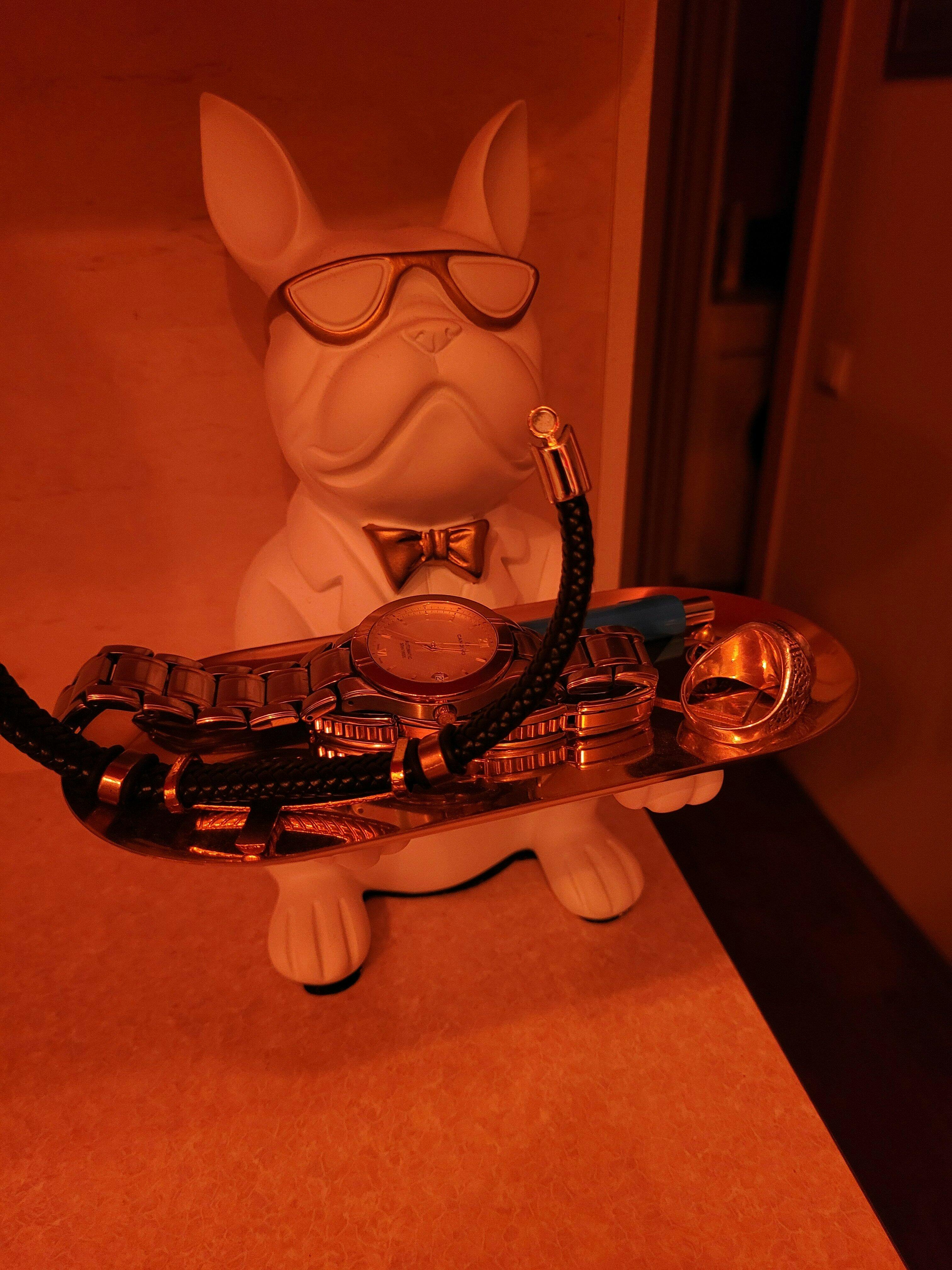 Элегантная и современная керамическая фигурка бульдога белого цвета с эффектными золотыми акцентами. Собака в стильных очках и галстуке-бабочке держит золотистый поднос, идеально подходящий для ключей, украшений, монет или других мелких предметов повседневного обихода.