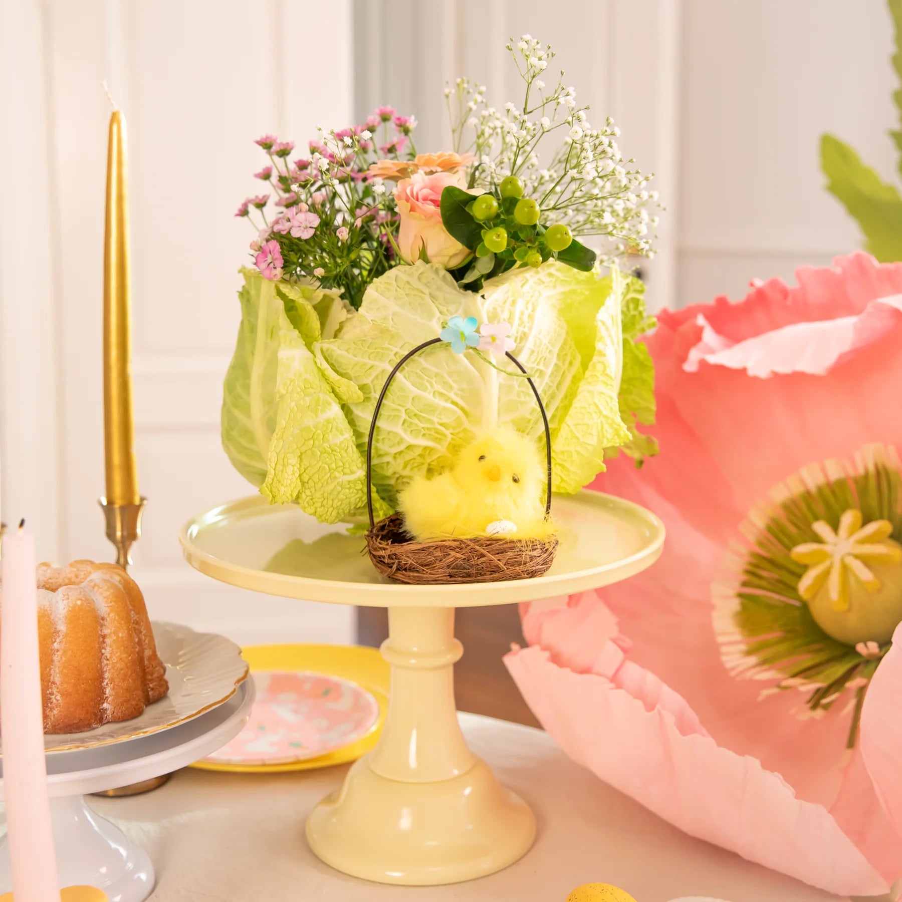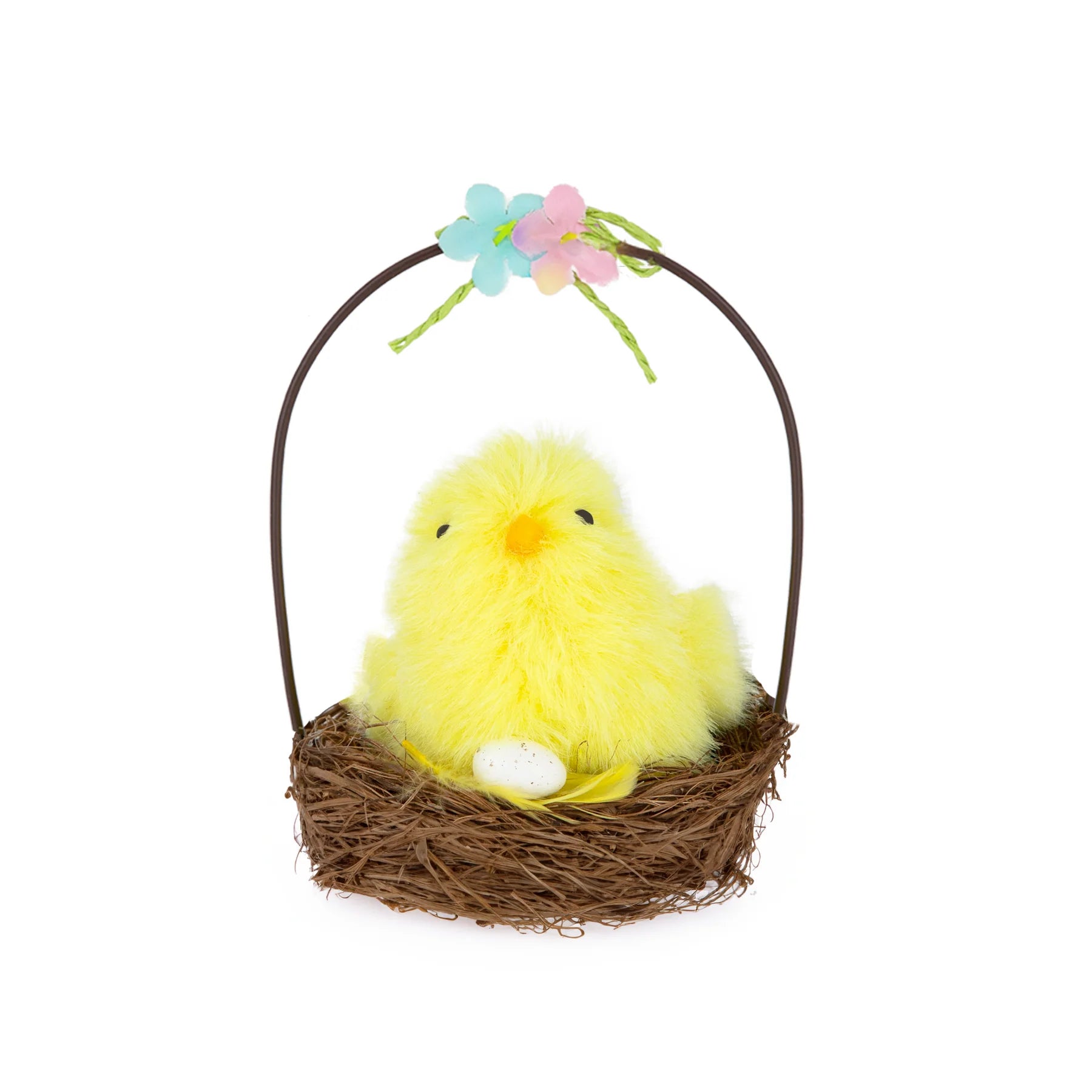 Mīļa un pavasarīga Lieldienu dekorācija – dzeltens cālītis ligzdiņas groziņā ar dekoratīvu rokturi un ziedu akcentu. Ideāli piemērots svētku galda noformējumam, skatlogiem un sezonas kompozīcijām.