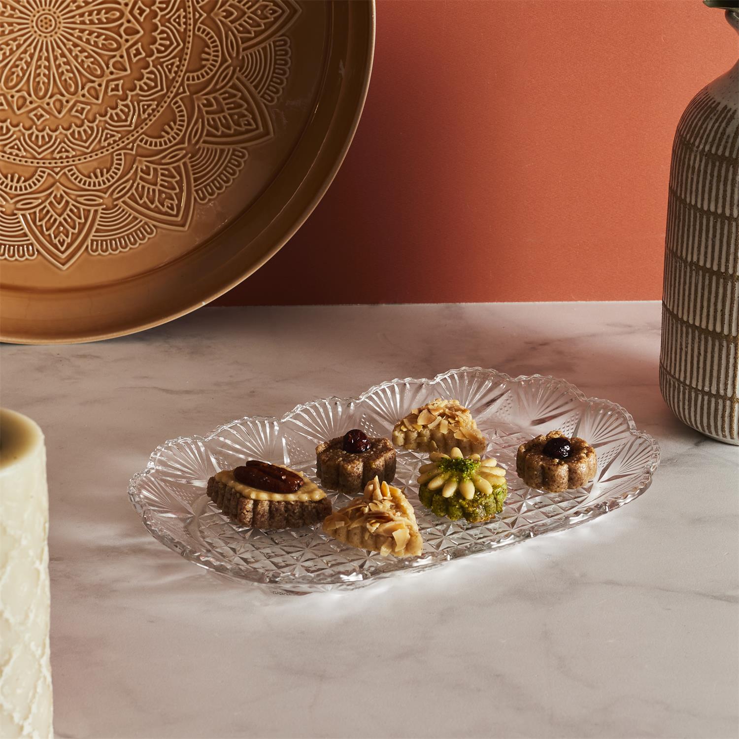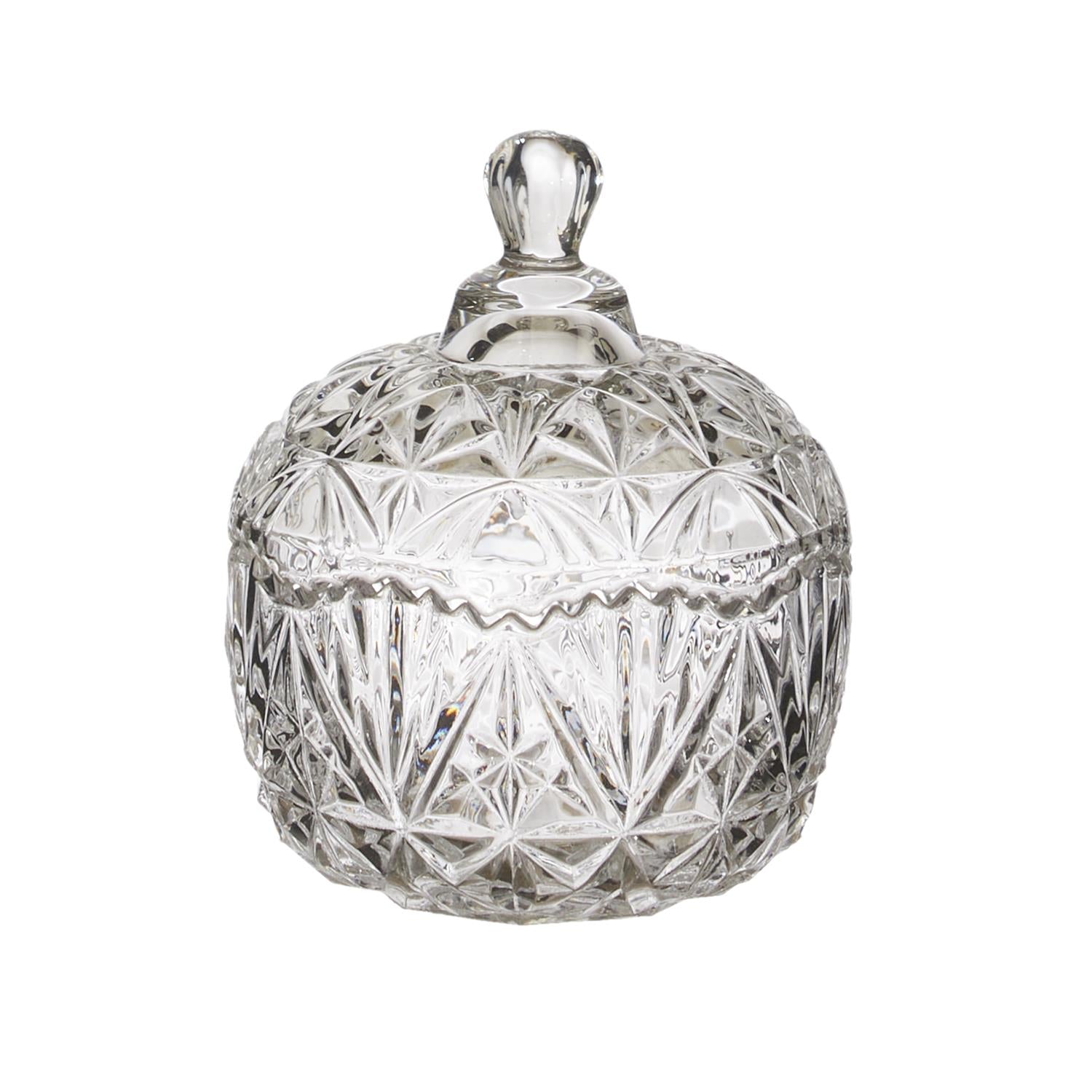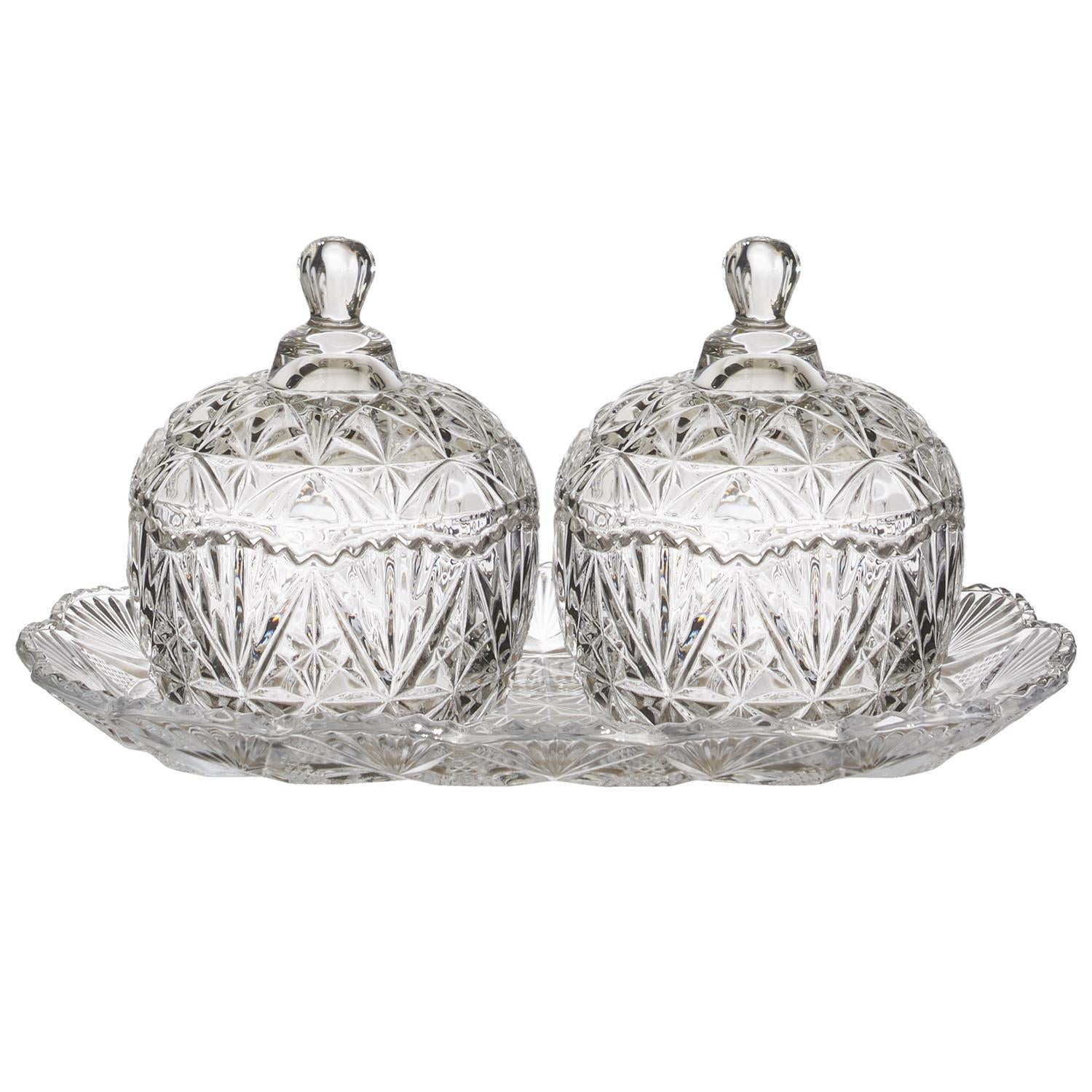 Izsmalcināts stikla trauku komplekts, kas sastāv no diviem dekoratīviem traukiem ar vākiem un paplātes. Bagātīgais reljefa raksts piešķir komplektam klasisku eleganci un greznu mirdzumu, kas skaisti atstaro gaismu un kļūst par izteiksmīgu akcentu interjerā.