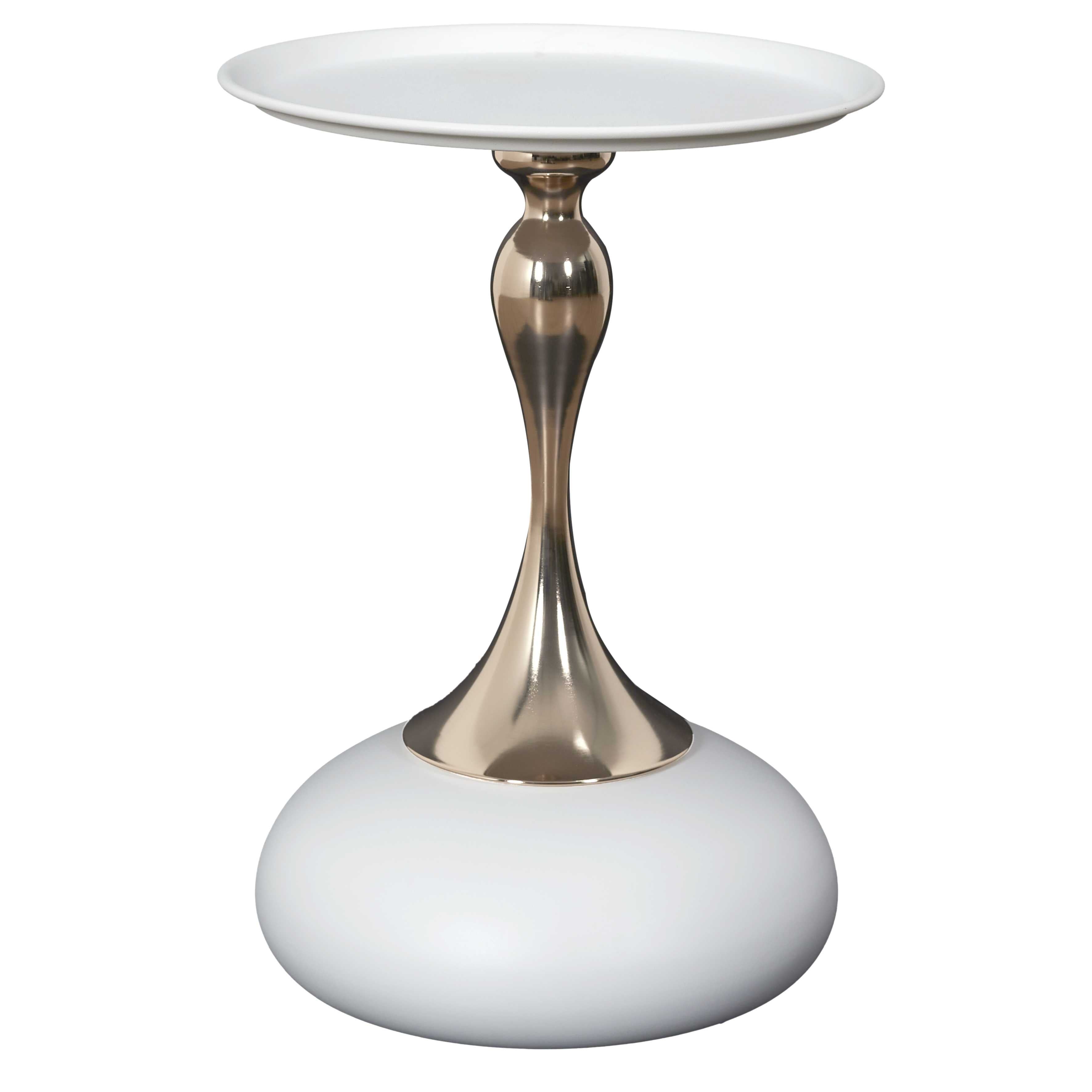 Šis elegantais dizaina sāna galdiņš ir izsmalcināts akcents modernam un klasiskam interjeram. Baltā, noapaļotā pamatne harmoniski kontrastē ar spīdīgo zelta krāsas metāla kāju, radot greznu, bet vienlaikus vieglu vizuālo iespaidu. Ideāli piemērots kā dīvāna galds, dekoru statīvs vai mazs kafijas galdiņš.
